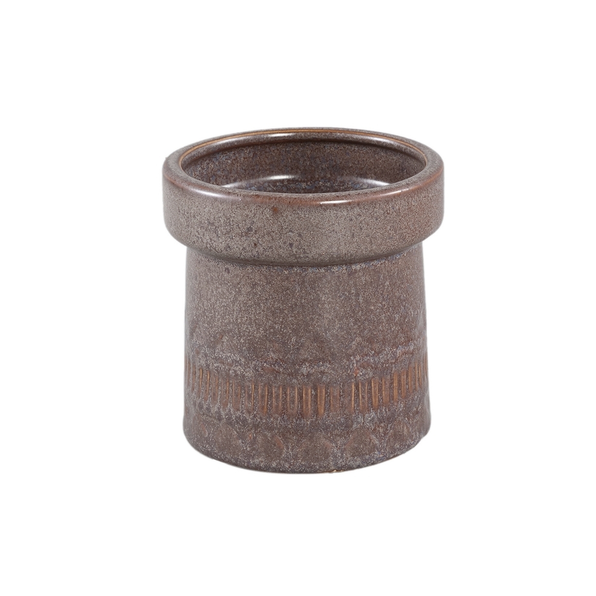 Le pot de fleurs est en céramique et décoré de rayures et de triangles sur tout son pourtour.