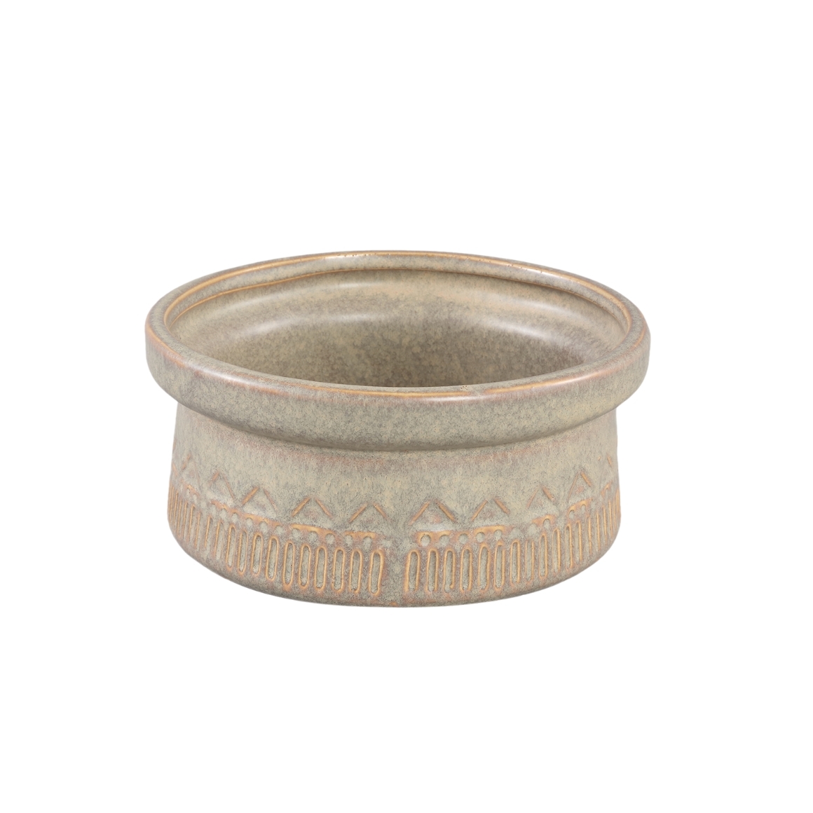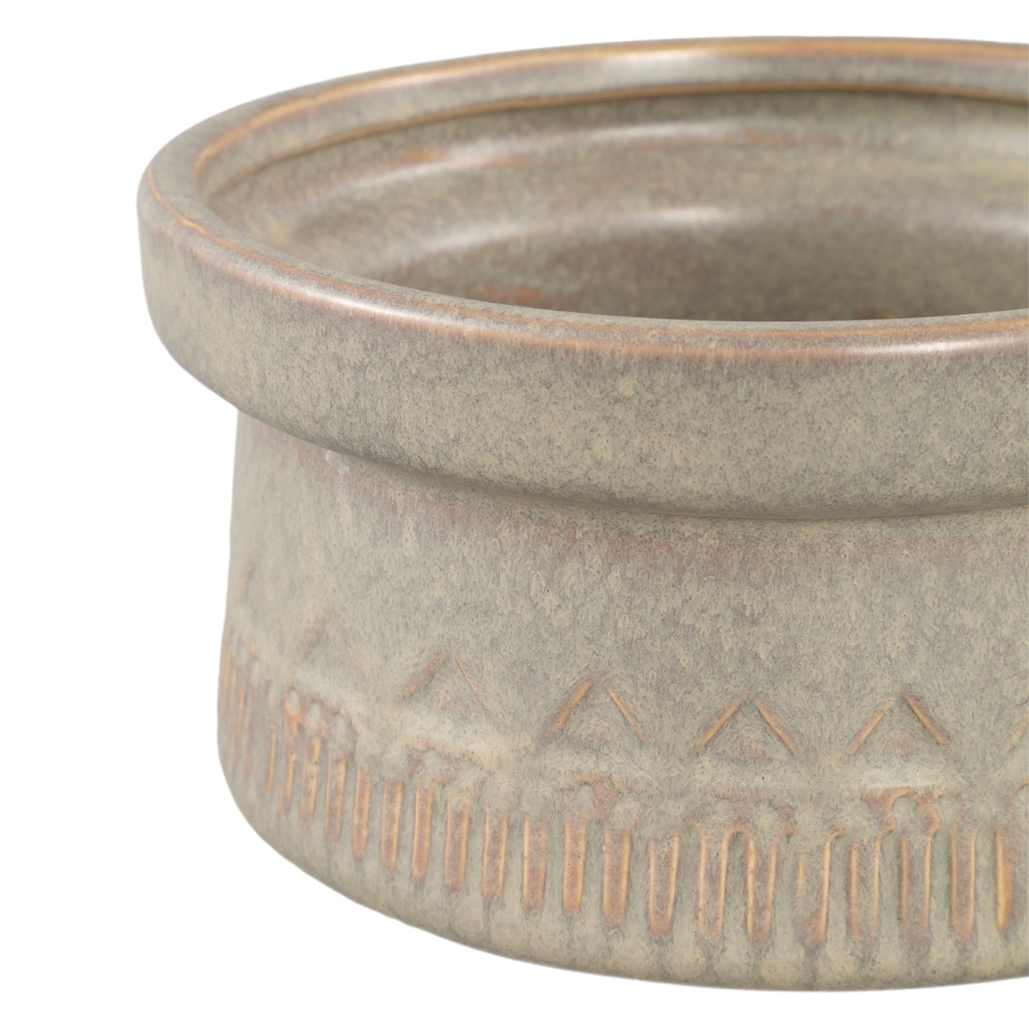 Le pot de fleurs est en céramique et décoré de rayures et de triangles sur tout son pourtour.