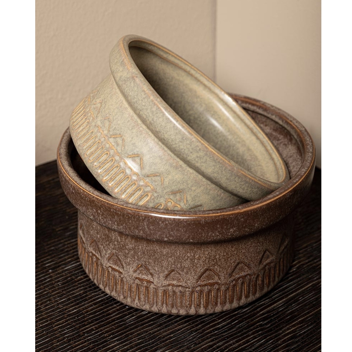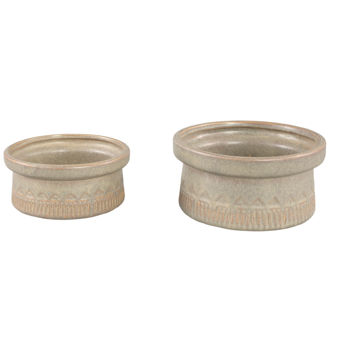 Le pot de fleurs est en céramique et décoré de rayures et de triangles sur tout son pourtour.