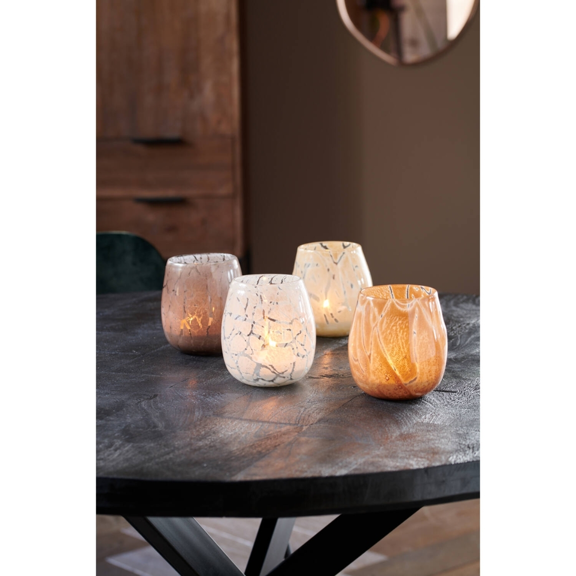 Glazen theelichthouder met decoratief craquelé-patroon voor een stijlvolle en sfeervolle uitstraling. Geschikt voor gebruik op tafels, dressoirs of in interieurarrangementen.
