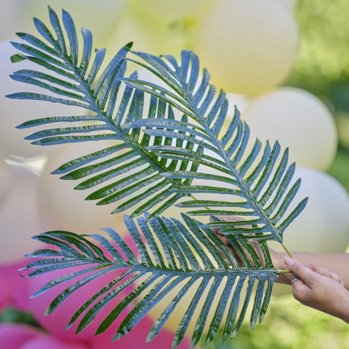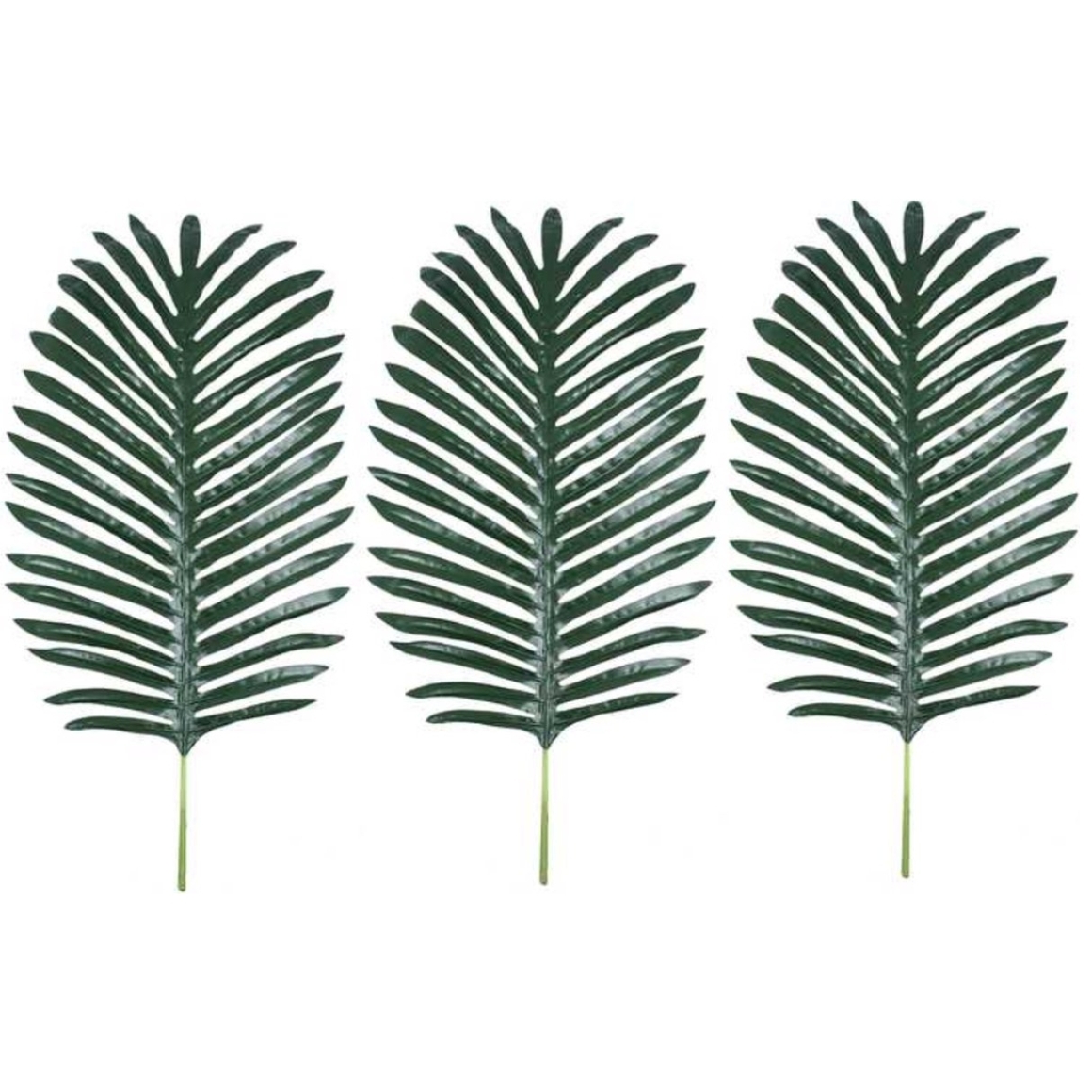 Set van 3 Ginger Ray kunsttakken in de vorm van palmbladeren, elk 50 cm lang. De bladeren zijn licht en flexibel, ideaal voor gebruik in bloemstukken, themadecoraties of ballonbogen. Perfect voor tropische feesten, zomerse gelegenheden en sfeervolle buitenevenementen.