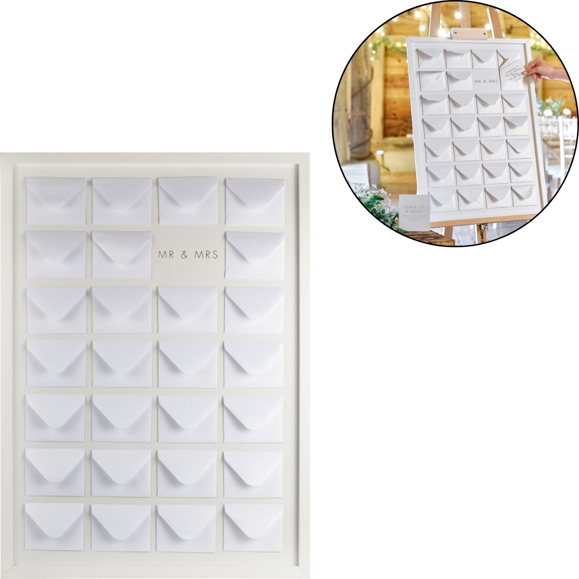 Stijlvol alternatief voor het traditionele gastenboek, bestaande uit 27 mini-enveloppen bevestigd op een wit frame. Gasten schrijven hun boodschap op de meegeleverde kaartjes en plaatsen deze in een van de enveloppen. Een origineel en decoratief element voor de bruiloft. Afmeting frame ca. 72 x 52 cm, enveloppen ca. 8 x 10 cm. Inclusief 27 kaartjes van 7,5 x 9,5 cm. Ezel niet inbegrepen.