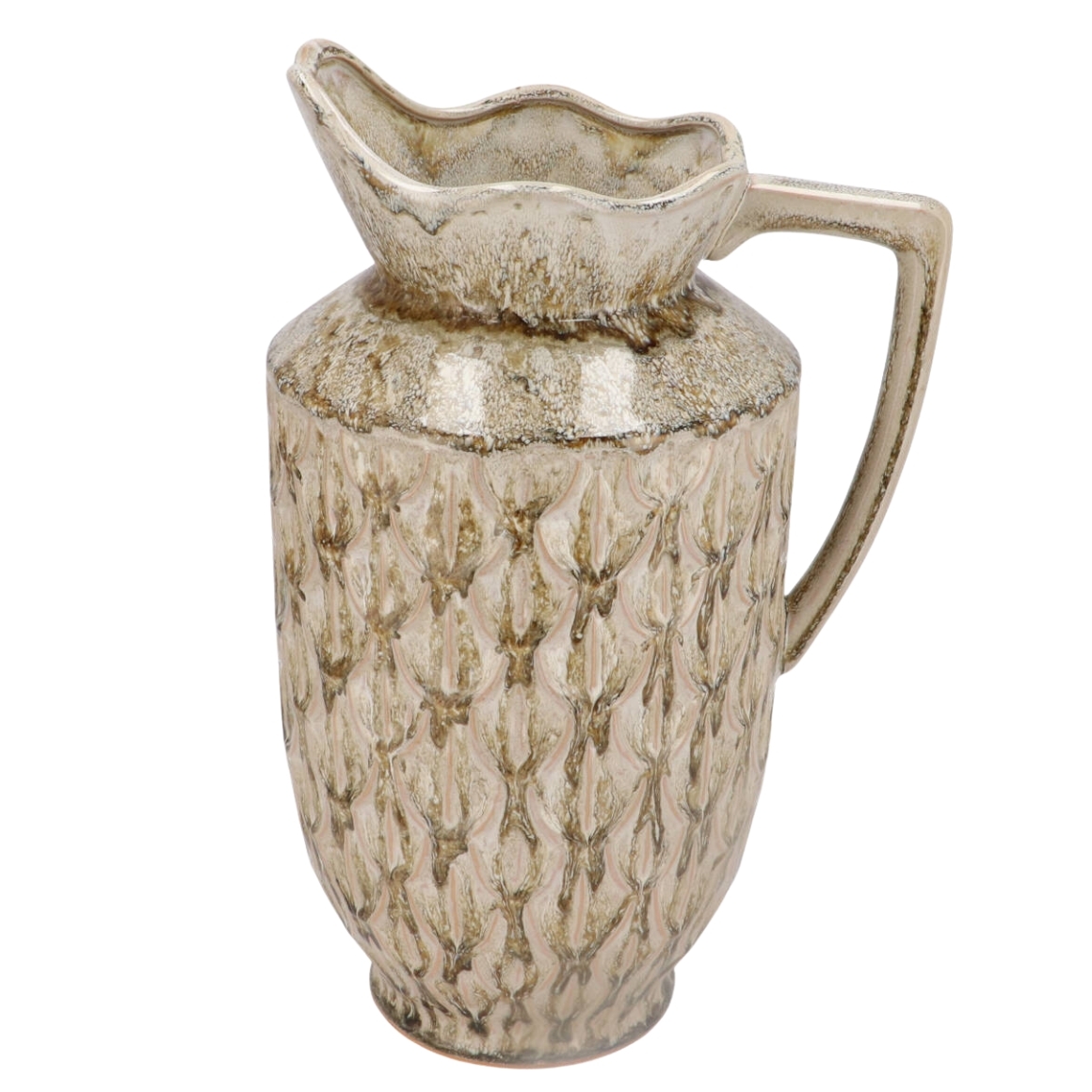 Breng stijl en karakter in huis met deze elegante vaas met verfijnd reliëfpatroon en organisch gevormde hals. Het robuuste handvat en de glanzende afwerking geven dit stuk een levendig, dynamisch uiterlijk. Perfect als blikvanger of gevuld met droogbloemen of takken, een tijdloze toevoeging aan moderne en rustieke interieurs. De vaas is waterdicht, maar giet voorzichtig om beschadiging van de naden te voorkomen.