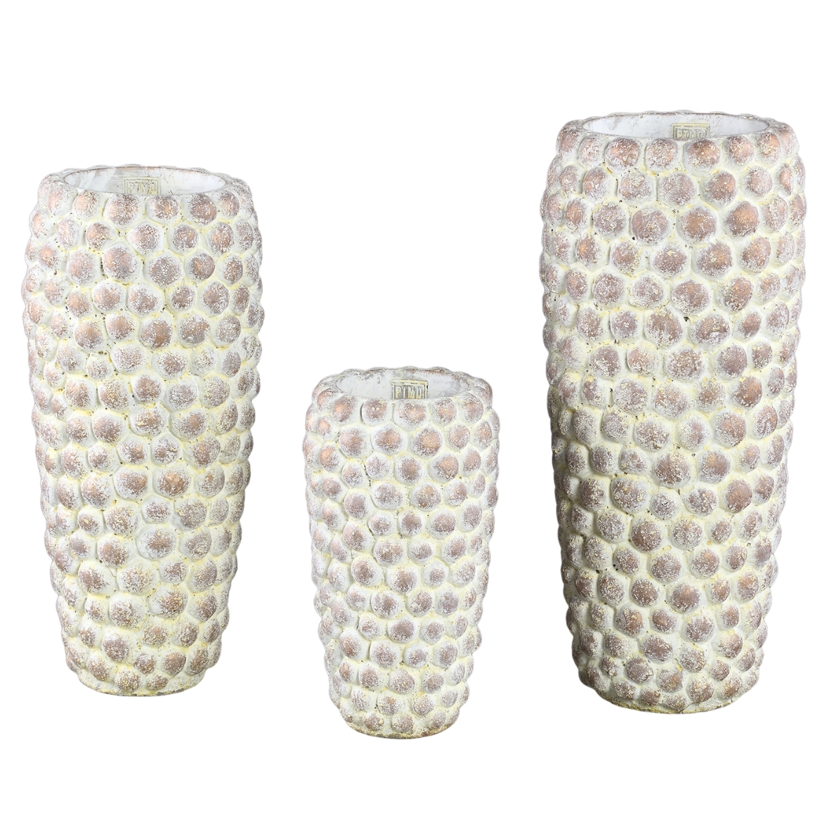 Cementen bloempot uit de Ruis-serie van PTMD, uitgevoerd in een warme cremekleur met een karakteristiek bolreliëf. De speelse textuur en robuuste uitstraling maken dit model een echte blikvanger voor binnenruimtes.