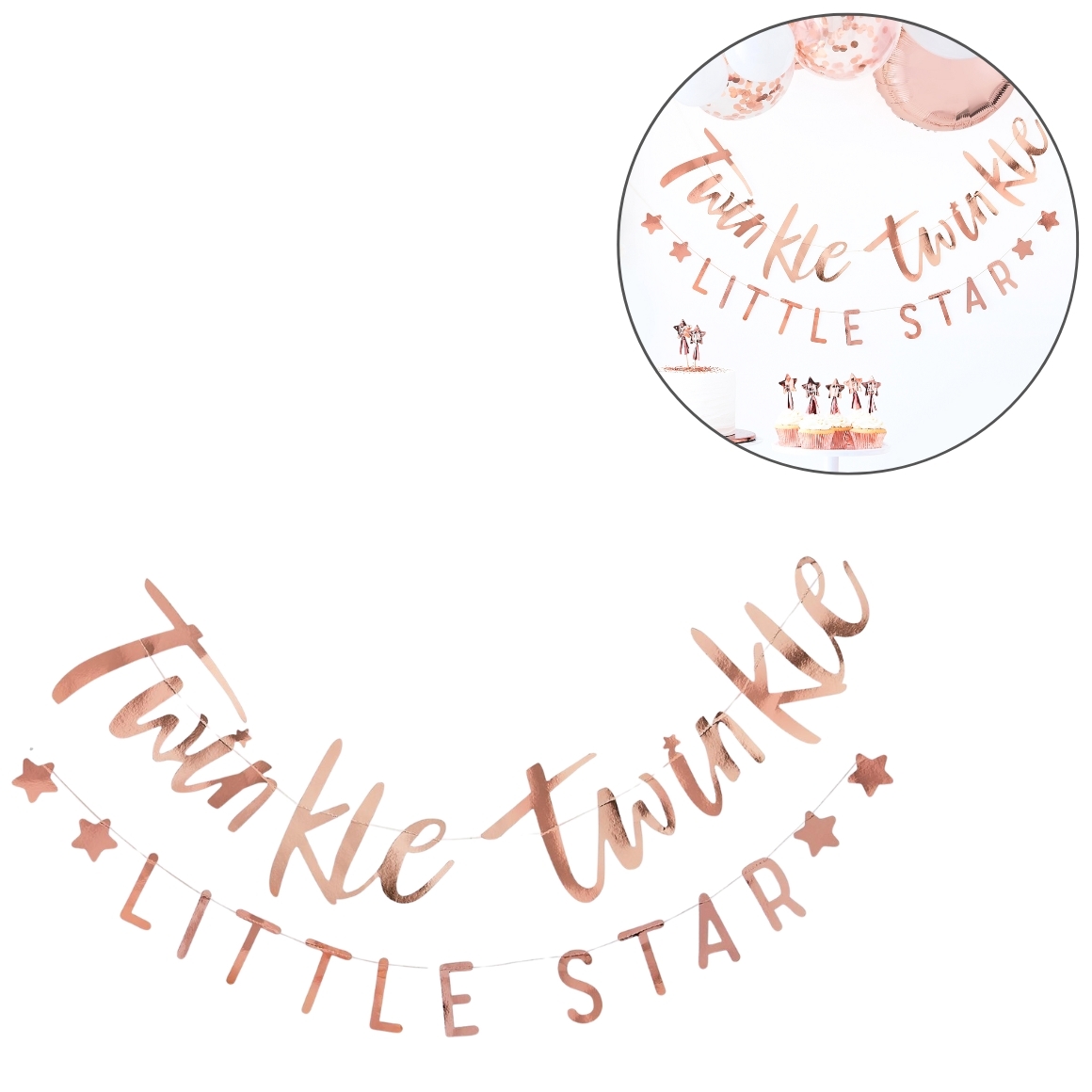 Deze feestelijke letterslinger uit de Twinkle Twinkle-serie van Ginger Ray is perfect voor een babyshower of geboorteviering. De tekst "Twinkle Twinkle, little star" is uitgevoerd in een opvallende metallic rosé goudkleurige folie, wat zorgt voor een stijlvolle en warme uitstraling. De totale lengte bedraagt 3 meter, verdeeld over twee delen van elk 1,5 meter. Dankzij het lichte materiaal is de slinger eenvoudig op te hangen.