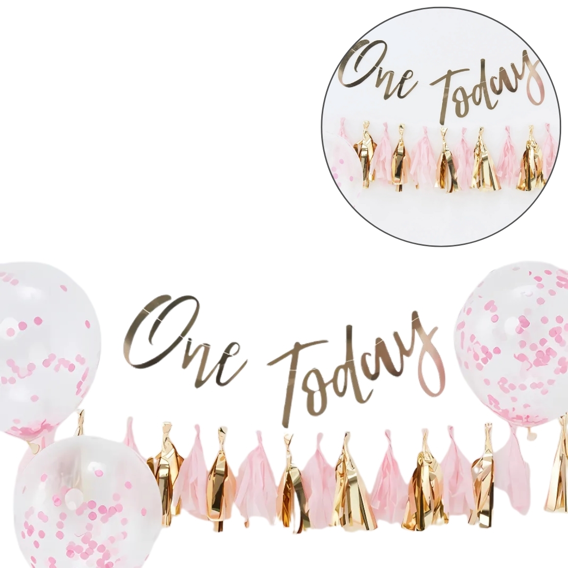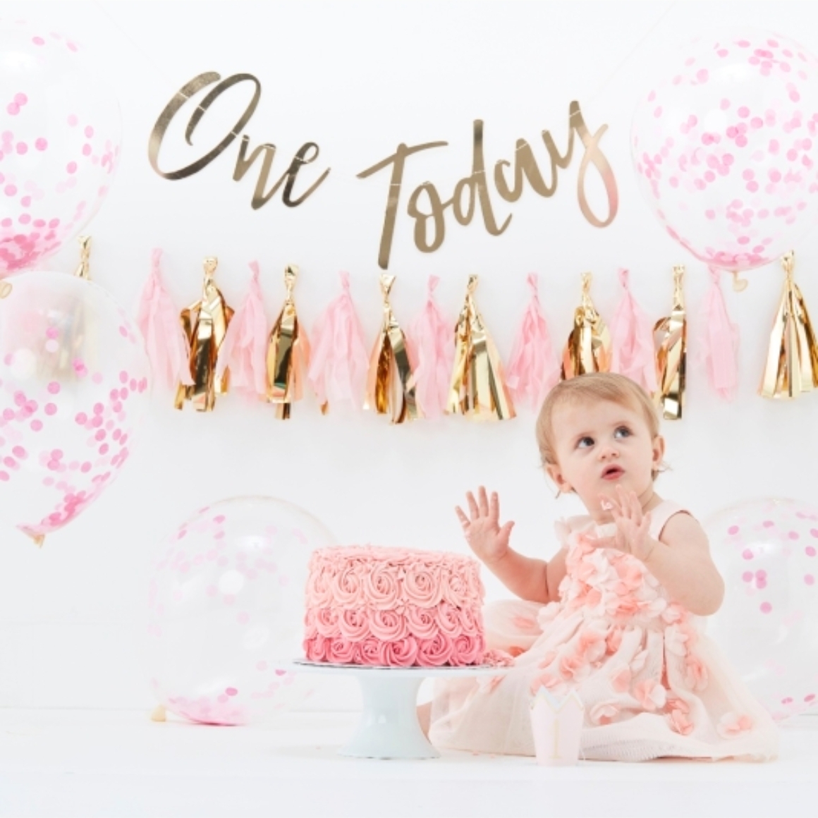 Maak van de eerste verjaardag een onvergetelijk moment met deze roze Cake Smash Kit van Ginger Ray. Deze set uit de Pick & Mix-serie bevat 8 feestelijke items, waaronder 5 ballonnen met confetti print, een slinger met de tekst "One Today", een extra slinger met roze franje, en een feesthoedje met het cijfer 1. Perfect voor een vrolijke fotoshoot met taart – houd de camera paraat!