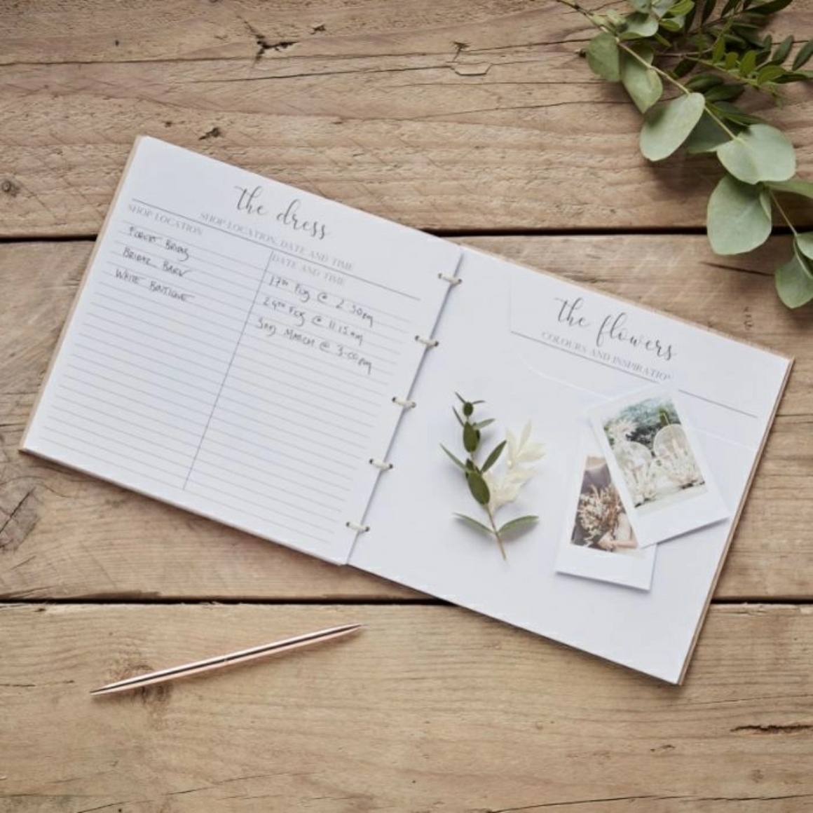 Plan je bruiloft moeiteloos en stijlvol met de Ginger Ray houten bruiloftsplanner. Deze planner is voorzien van handige tabbladen, enveloppen en handige prompts die je helpen alles overzichtelijk te houden. Met 5 bewaarpockets voor belangrijke herinneringen en 48 pagina’s om al je ideeën, afspraken en to-do’s op te schrijven.