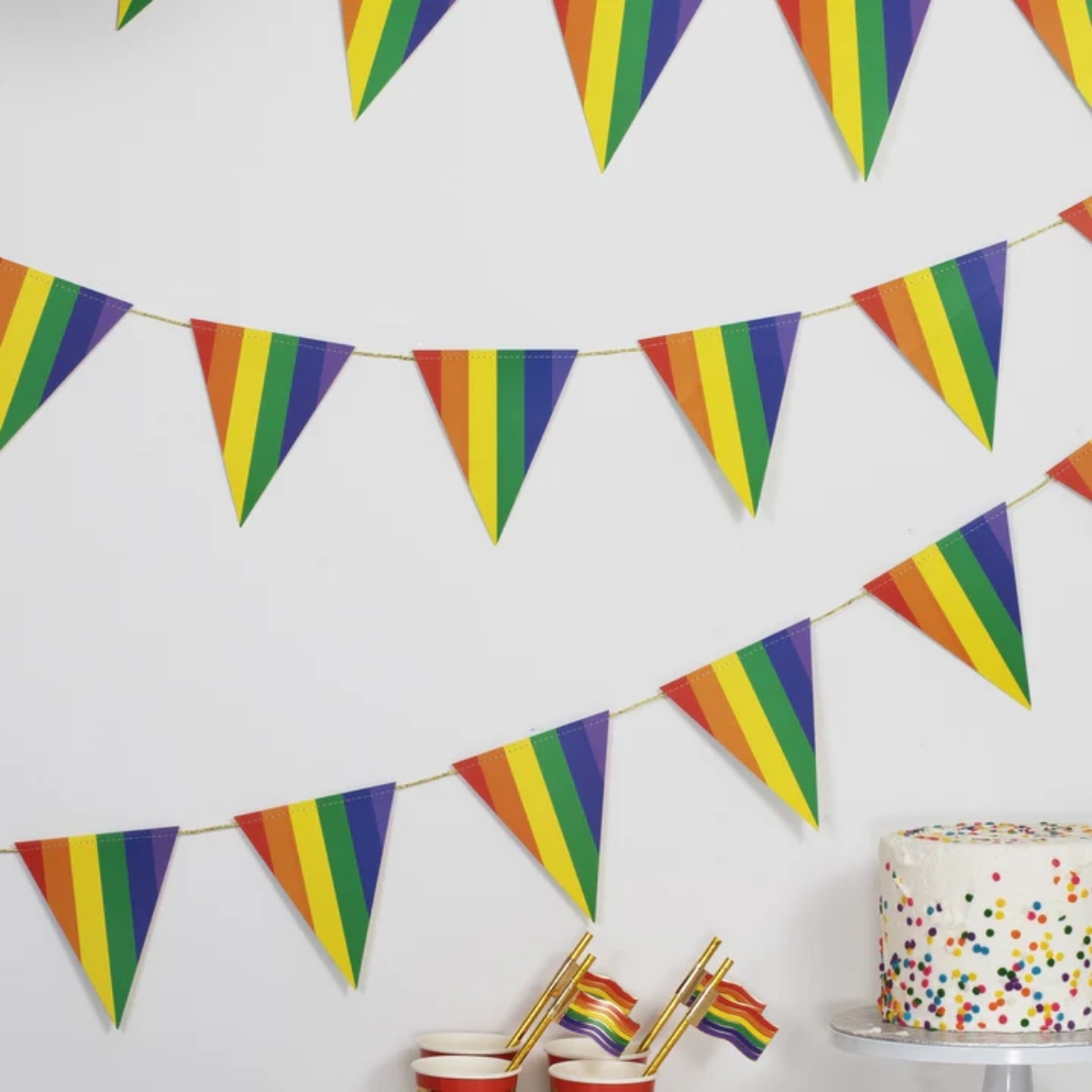 Vrolijke vlaggenlijn van Ginger Ray in regenboogkleuren. De lijn bestaat uit driehoekige vlaggetjes en heeft een totale lengte van 5 meter – perfect voor verjaardagen, kinderfeestjes of andere feestelijke gelegenheden. Gemakkelijk op te hangen en herbruikbaar.