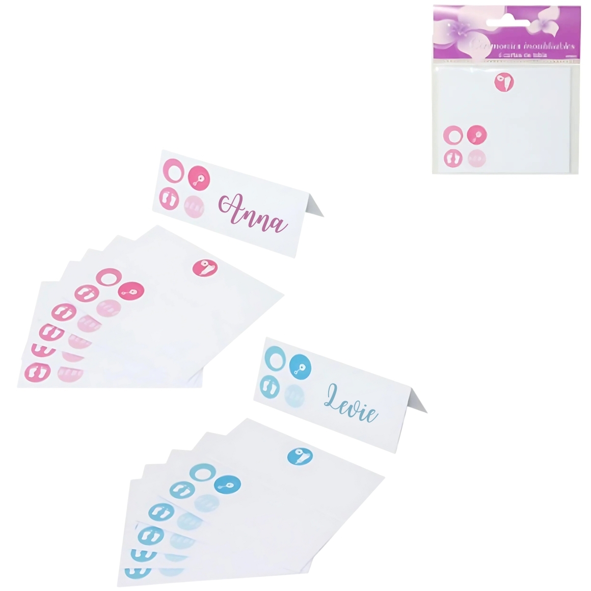 Deze feestelijke tafelkaartjes zijn speciaal ontworpen voor een babyshower of kraamfeest en worden geleverd in een set van 6. Elk kaartje is dubbel te vouwen en heeft een breedte van 10 cm, waardoor ze perfect zijn voor namen, tafelnummering of een korte boodschap. De kaartjes zijn beschikbaar in blauw of roze en voegen een sfeervol accent toe aan iedere feesttafel.