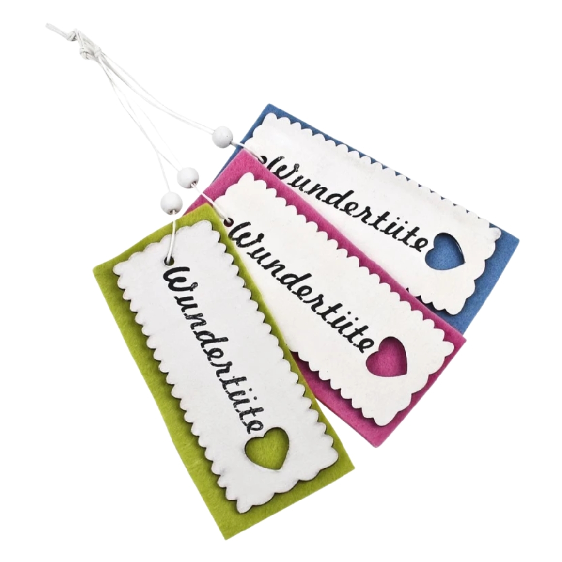 Deze vrolijke decoratiehanger met de Duitstalige tekst "Wundertüte" is gemaakt van hout en vilt en voorzien van een ophangkoord met kralen. Verkrijgbaar in drie kleurvarianten: roze, blauw en groen. De hanger meet 13 cm in lengte en is een speelse toevoeging aan een cadeau, deurklink of tak in een decoratief arrangement.