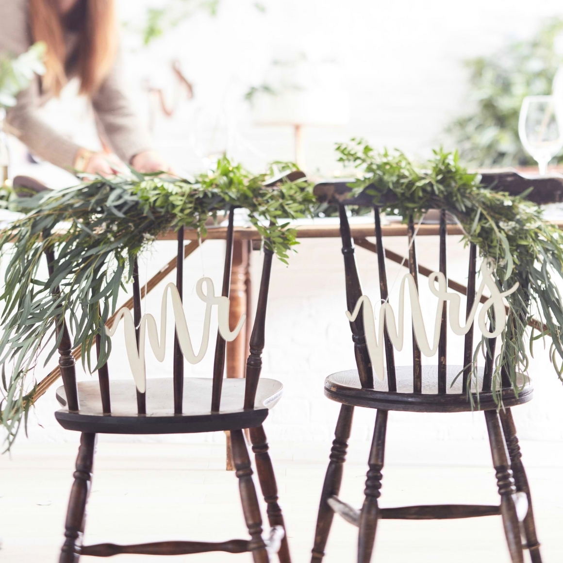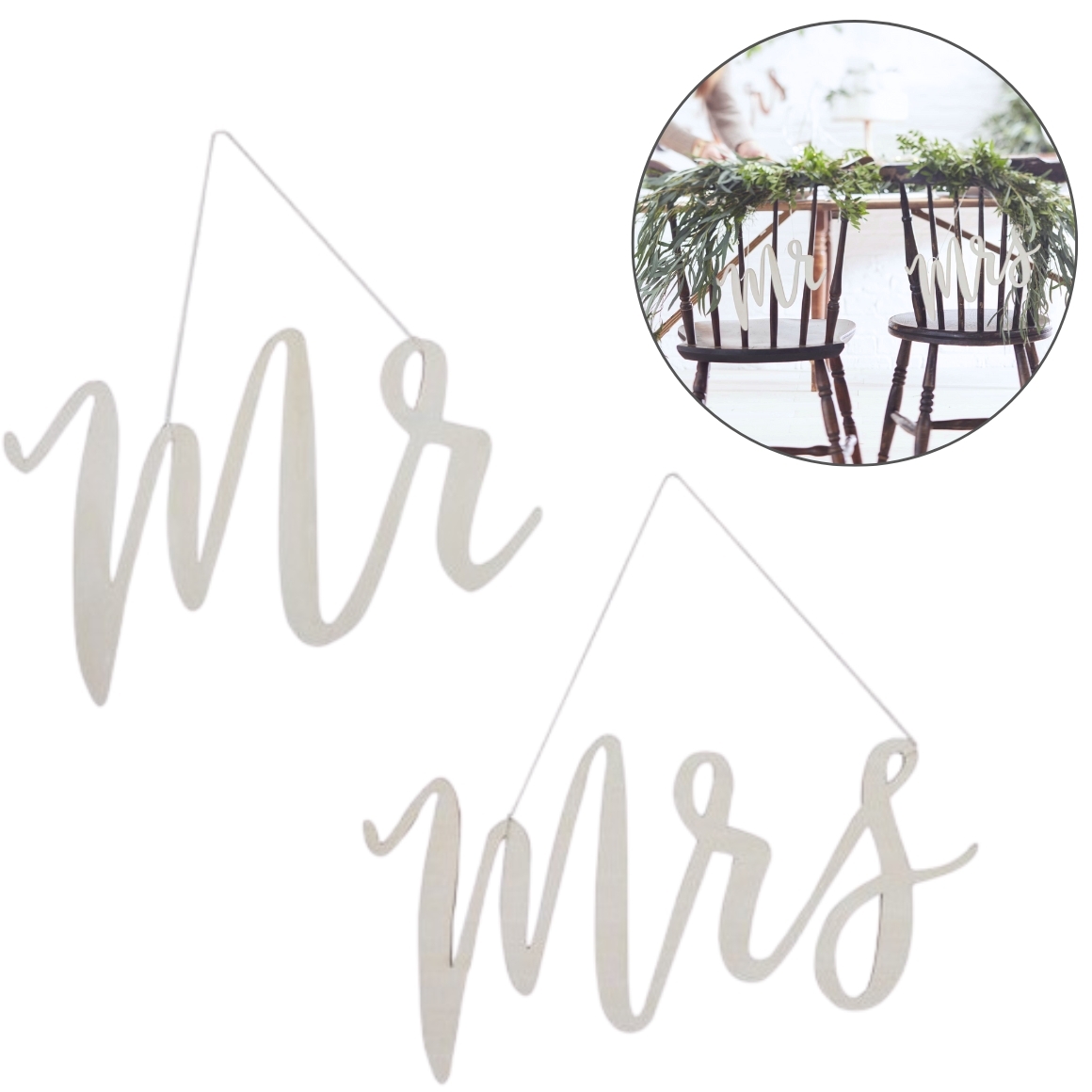 Decoratieve houten stoelhangers van het merk Ginger Ray, perfect voor bruiloften. Set van 2 stuks met opschrift ‘Mr’ en ‘Mrs’. Inclusief ophangkoord om eenvoudig aan stoelen te bevestigen.