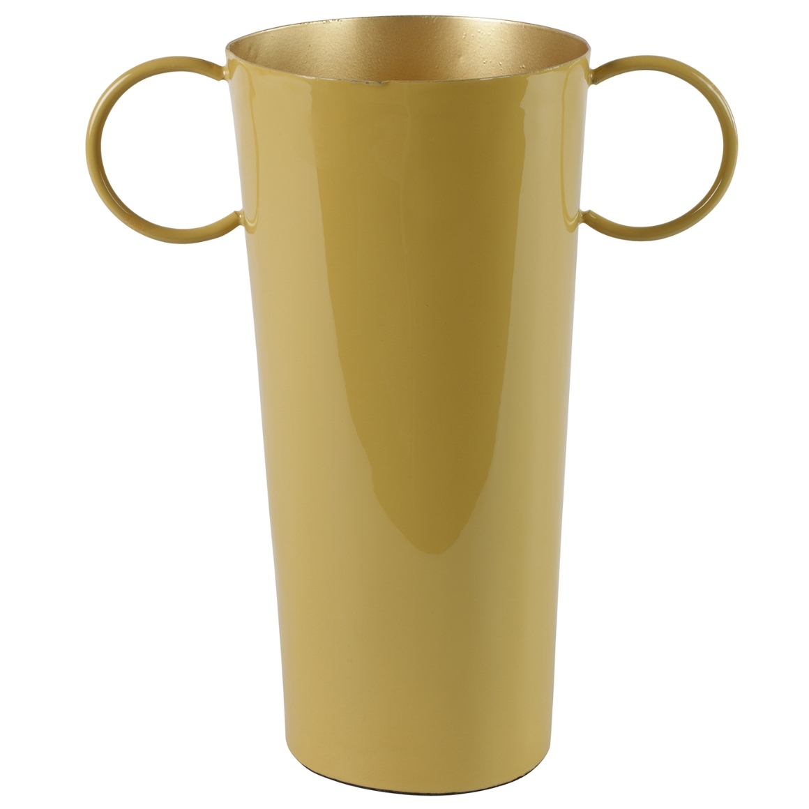 Vaas uit de Fido-serie van Countryfield, uitgevoerd in metaal met een opvallende gele buitenzijde en een goudkleurige binnenkant. De XL-uitvoering van 25 cm hoog heeft twee decoratieve oren en een speelse midcentury uitstraling. Geschikt voor bloemen, takken of als los decoratiestuk om kleur toe te voegen aan ieder interieur.