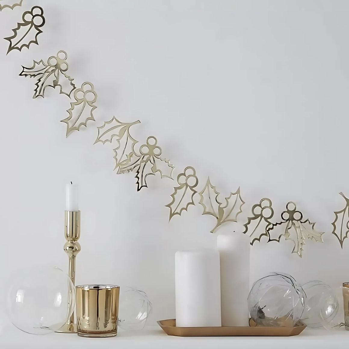 Deze slinger van Ginger Ray komt uit de Gold Glitter collectie en is een echte blikvanger voor de feestdagen. De slinger bestaat uit 15 hulsttakjes, elk voorzien van een glanzende goudkleurige folieafwerking. Met een totale lengte van 2 meter is deze decoratieve slinger perfect om op te hangen langs muren, ramen of feesttafels. Ideaal als stijlvolle kerstversiering die moeiteloos een feestelijke sfeer creëert.