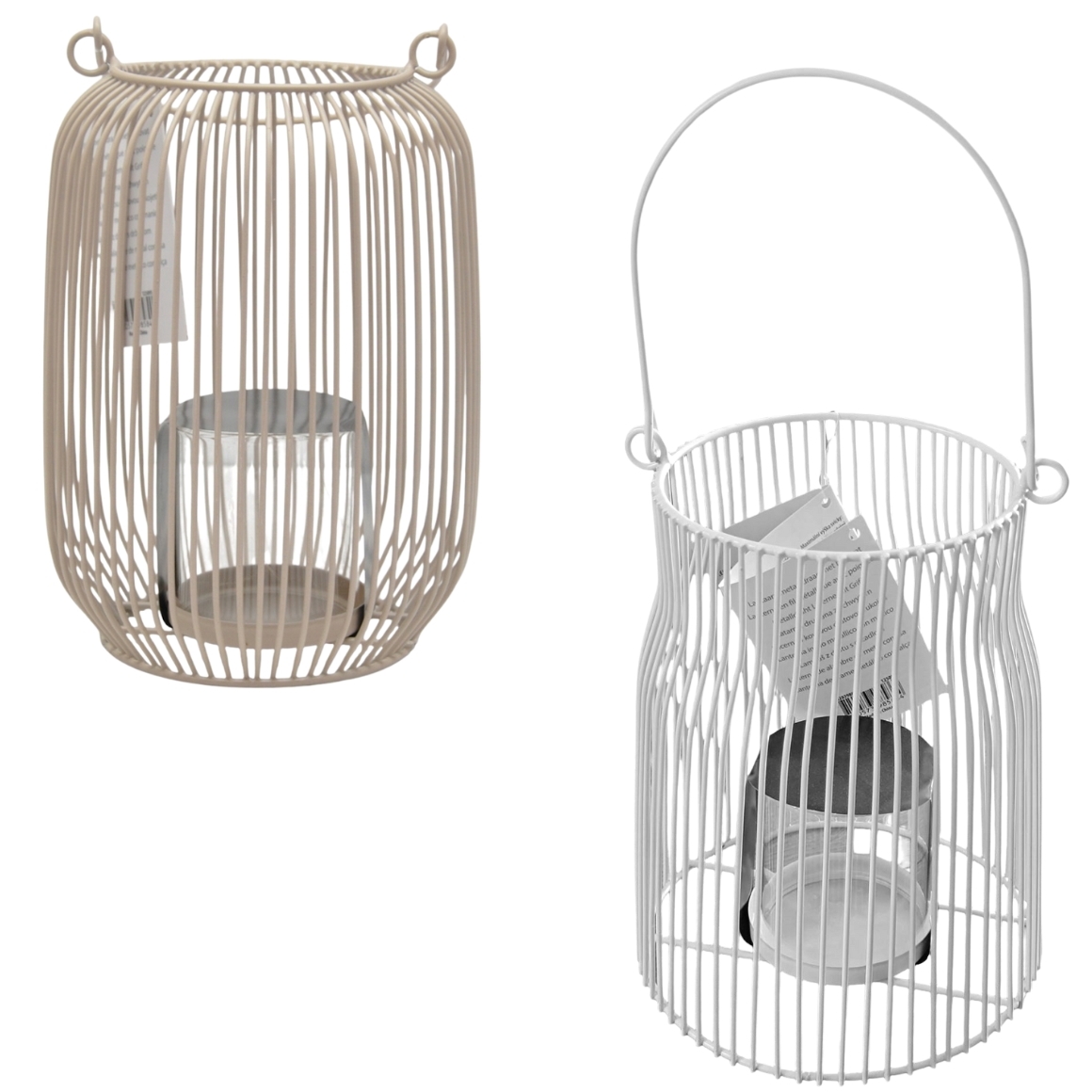 Lantaarn van metaaldraad met glazen inzet, geschikt voor theelichten. Uitgevoerd in beige of wit, met twee verschillende vormen. Voorzien van hengsel, ideaal voor gebruik binnen of buiten op het terras. Zorgt voor sfeervol licht.