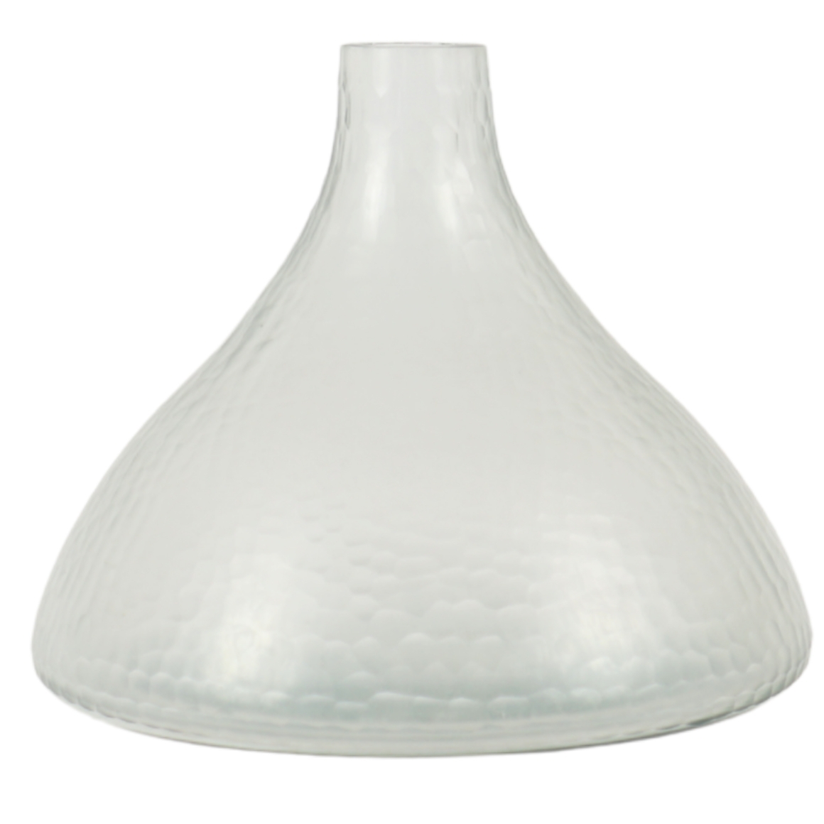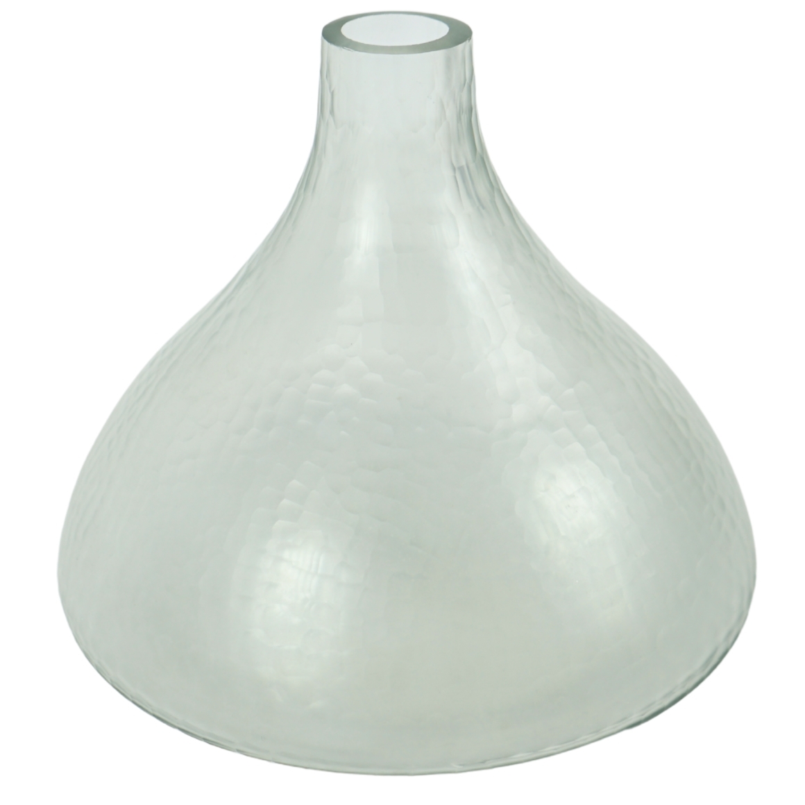 Deze stijlvolle vaas is gemaakt van helder glas met een subtiele gehamerde structuur die een speels en elegant effect geeft. Dankzij de brede, bolvormige onderkant en smalle hals heeft de vaas een moderne en tijdloze uitstraling. Perfect om solo neer te zetten als decoratief object of te combineren met enkele losse takken of bloemen.