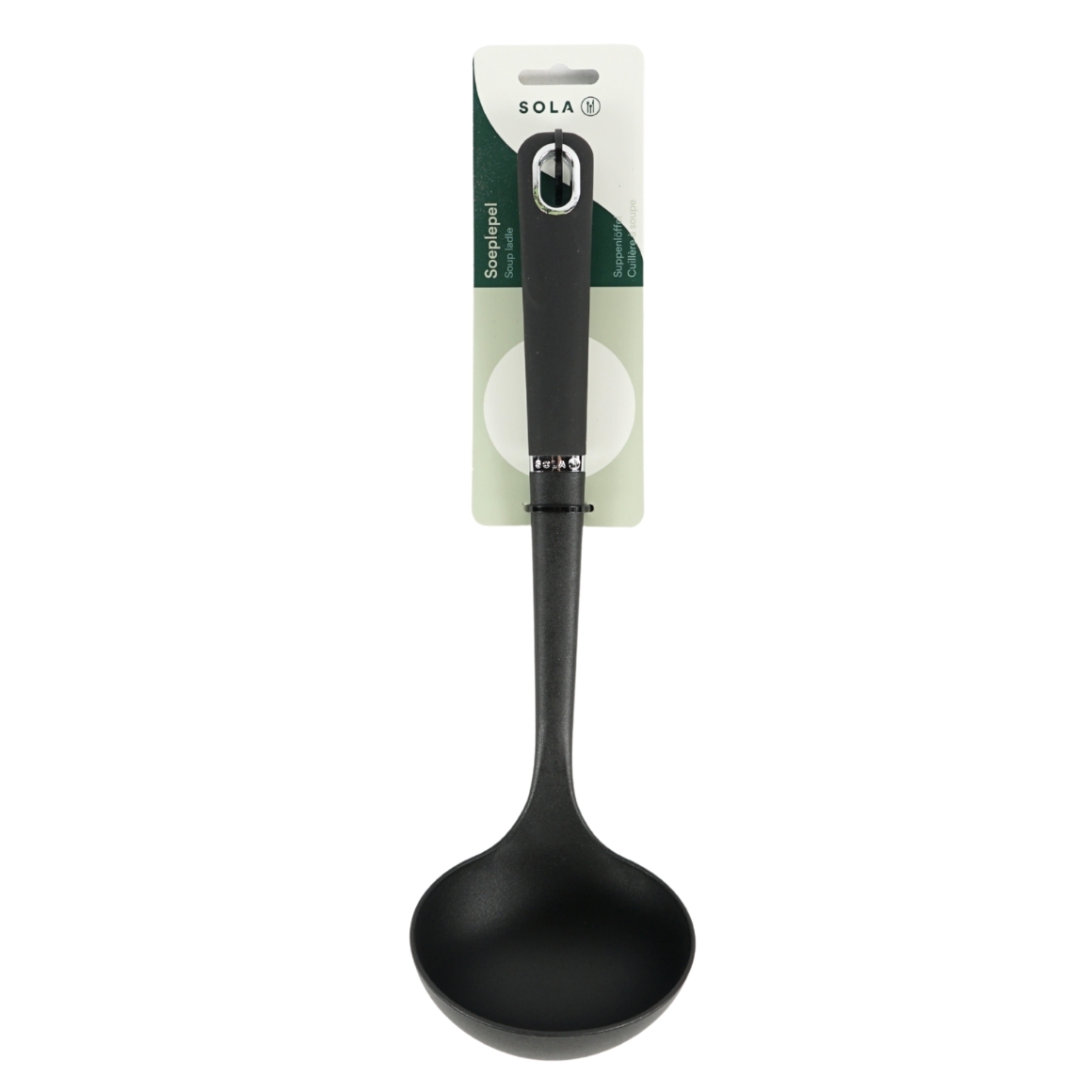 Deze zwarte soeplepel van Sola is ontworpen voor comfortabel en efficiënt gebruik bij het serveren van soep en andere vloeibare gerechten. De lepel is vervaardigd uit stevig kunststof en voorzien van een ergonomisch siliconen handvat met goede grip. De diepe lepelbak maakt het opscheppen eenvoudig en zorgt voor een royale inhoud. De totale lengte van de soeplepel bedraagt 33 cm. Dankzij de opstaande rand blijft de lepel van het werkblad af, wat zorgt voor hygiënisch gebruik. Hittebestendig tot 210 graden en geschikt voor de vaatwasser.