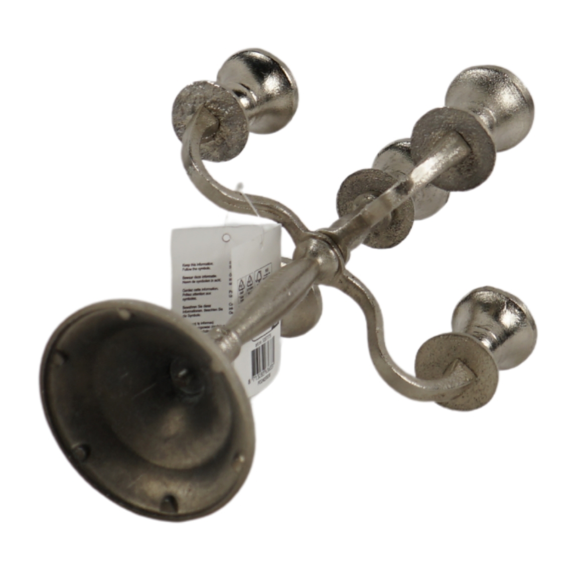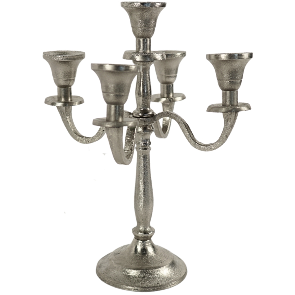 Stijlvolle kandelaar van aluminium met 5 armen. De kandelaar heeft een elegante zilverkleurige afwerking en is perfect geschikt voor dinerkaarsen, waardoor het een sfeervolle toevoeging is aan elke tafelsetting. De kandelaar is perfect geschikt voor dinerkaarsen met een diameter van 2,1 cm.