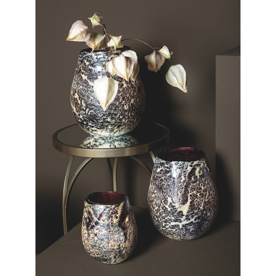 Dit stijlvolle windlicht uit de Jice-serie van PTMD is gemaakt van bordeauxkleurig glas met een subtiele aardse print. Het zorgt voor een sfeervol lichteffect zodra je er een theelicht of kleine stompkaars in plaatst. Met een hoogte van 15 cm is dit windlicht een decoratieve toevoeging aan elk interieur, zowel op tafel als op een dressoir.
