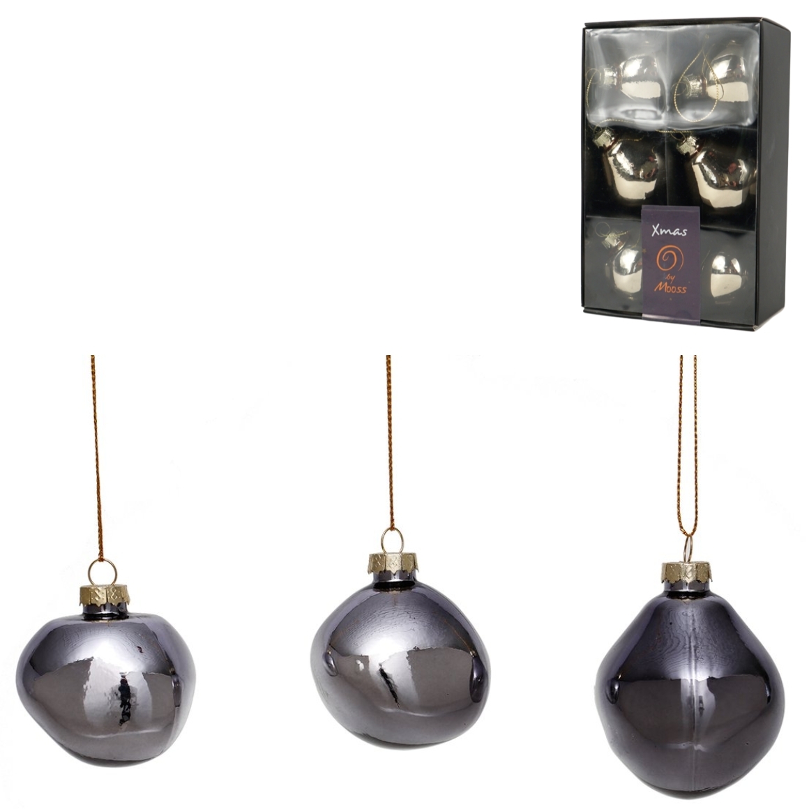 Organisch gevormde kerstballen in drie verschillende modellen, uitgevoerd in glas met een moderne uitstraling. Elke zwarte displaydoos bevat zes kerstballen: twee van elk model. De diameter van de ballen bedraagt ongeveer 6 cm. Het voorbeeld van de verpakking toont de champagnekleurige versie.