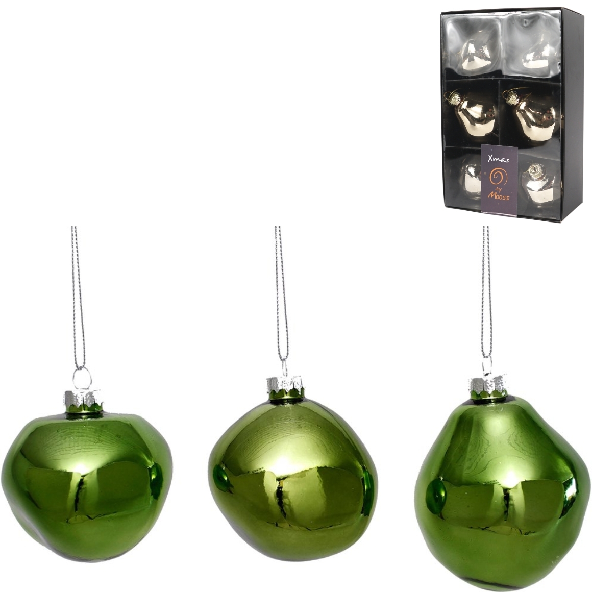Organisch gevormde kerstballen in drie verschillende modellen, uitgevoerd in glas met een moderne uitstraling. Elke zwarte displaydoos bevat zes kerstballen: twee van elk model. De diameter van de ballen bedraagt ongeveer 8 cm. Het voorbeeld van de verpakking toont de champagnekleurige versie.
