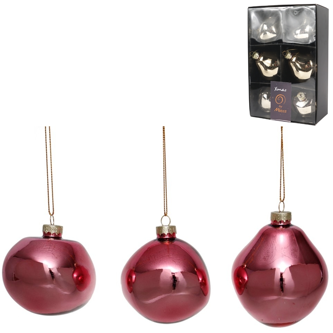 Organisch gevormde kerstballen in drie verschillende modellen, uitgevoerd in glas met een moderne uitstraling. Elke zwarte displaydoos bevat zes kerstballen: twee van elk model. De diameter van de ballen bedraagt ongeveer 8 cm. Het voorbeeld van de verpakking toont de champagnekleurige versie.