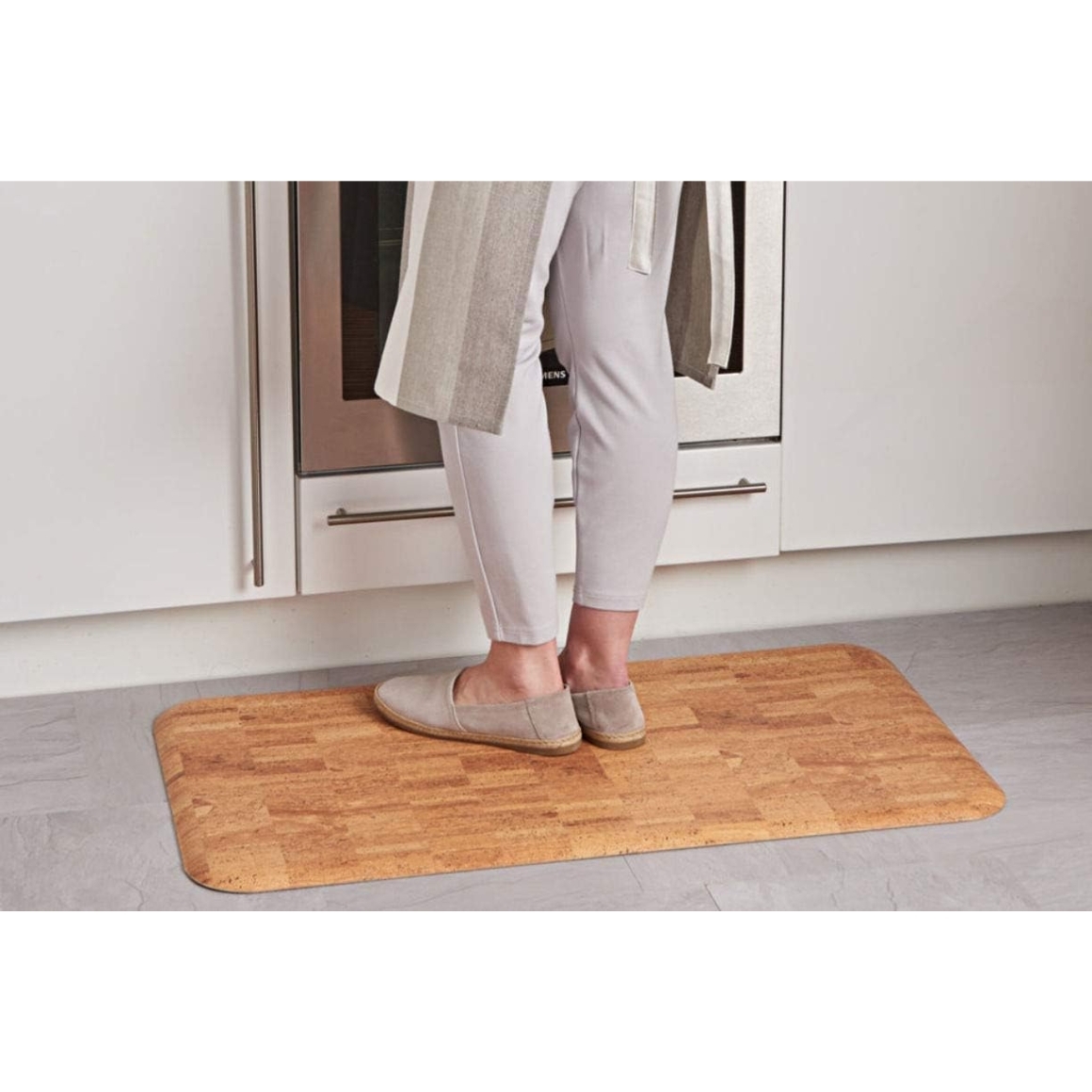 Anti-vermoeidheidsmat in kurklook met een afmeting van 90 x 50 cm. De mat is vervaardigd uit polyurethaanschuim en kunststof, zacht gevoerd en antislip. Met een gewicht van ca. 1,9 kg is de mat eenvoudig te verplaatsen. Ontworpen om de druk op rug en gewrichten bij lang staan aanzienlijk te verlichten.