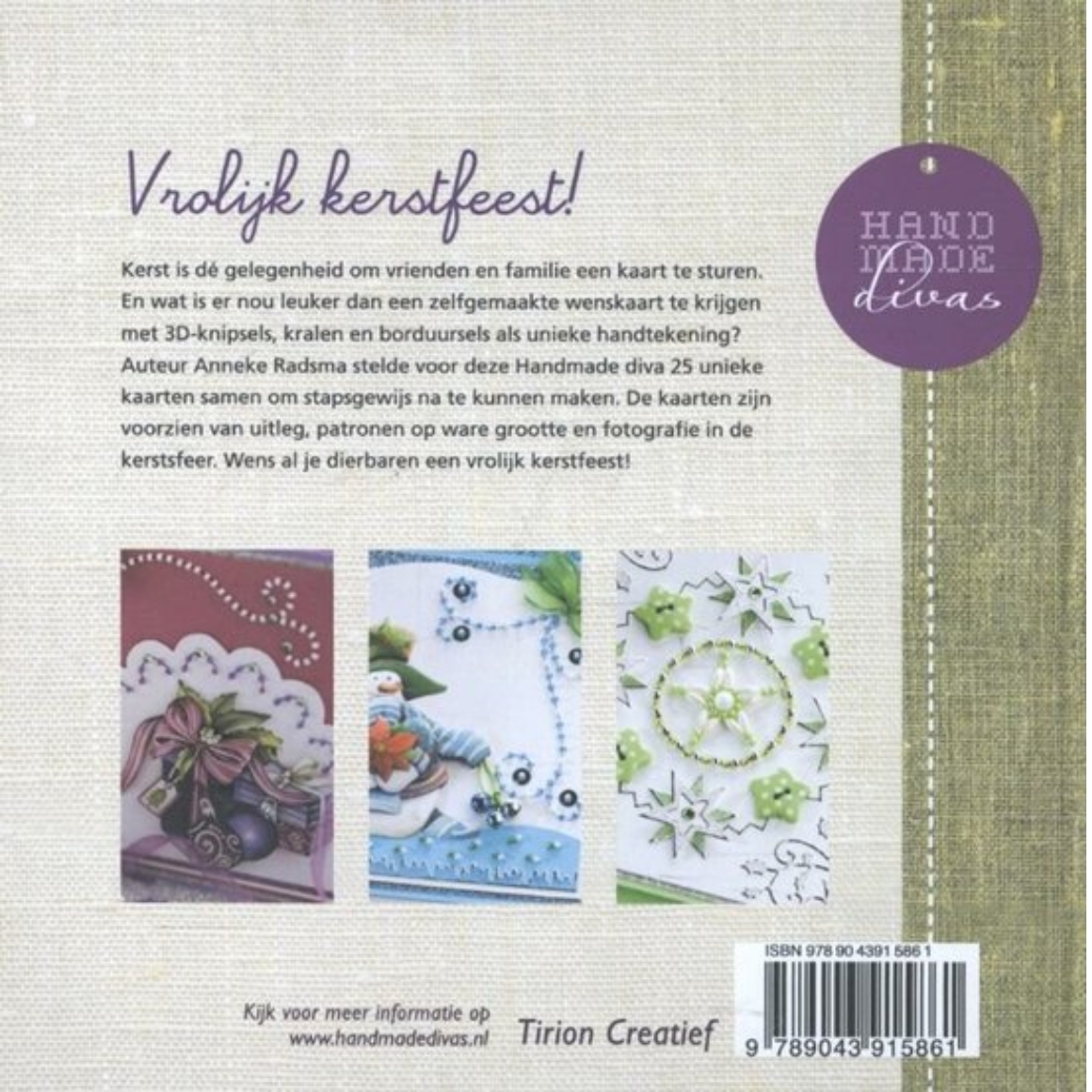 Kerst is de perfecte gelegenheid om vrienden en familie een persoonlijke wenskaart te sturen. Met dit Handmade Divas boek maak je zelf sfeervolle kerstkaarten met kralen, 3D-elementen en borduursels. Auteur Anneke Radsma stelde 25 unieke projecten samen die stap voor stap worden uitgelegd met duidelijke patronen op ware grootte en sfeervolle fotografie.