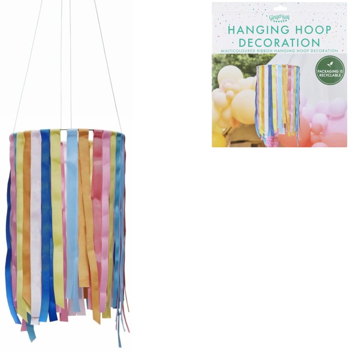 Geef je feest extra kleur met deze regenboog hoepel decoratie van 50 cm hoog. De set bevat een metalen hoepel van 30 cm diameter en 8 rollen lint van 3,9 tot 4,9 meter. Eenvoudig te monteren en op te hangen met het draad. Geschikt voor gebruik binnen en buiten.