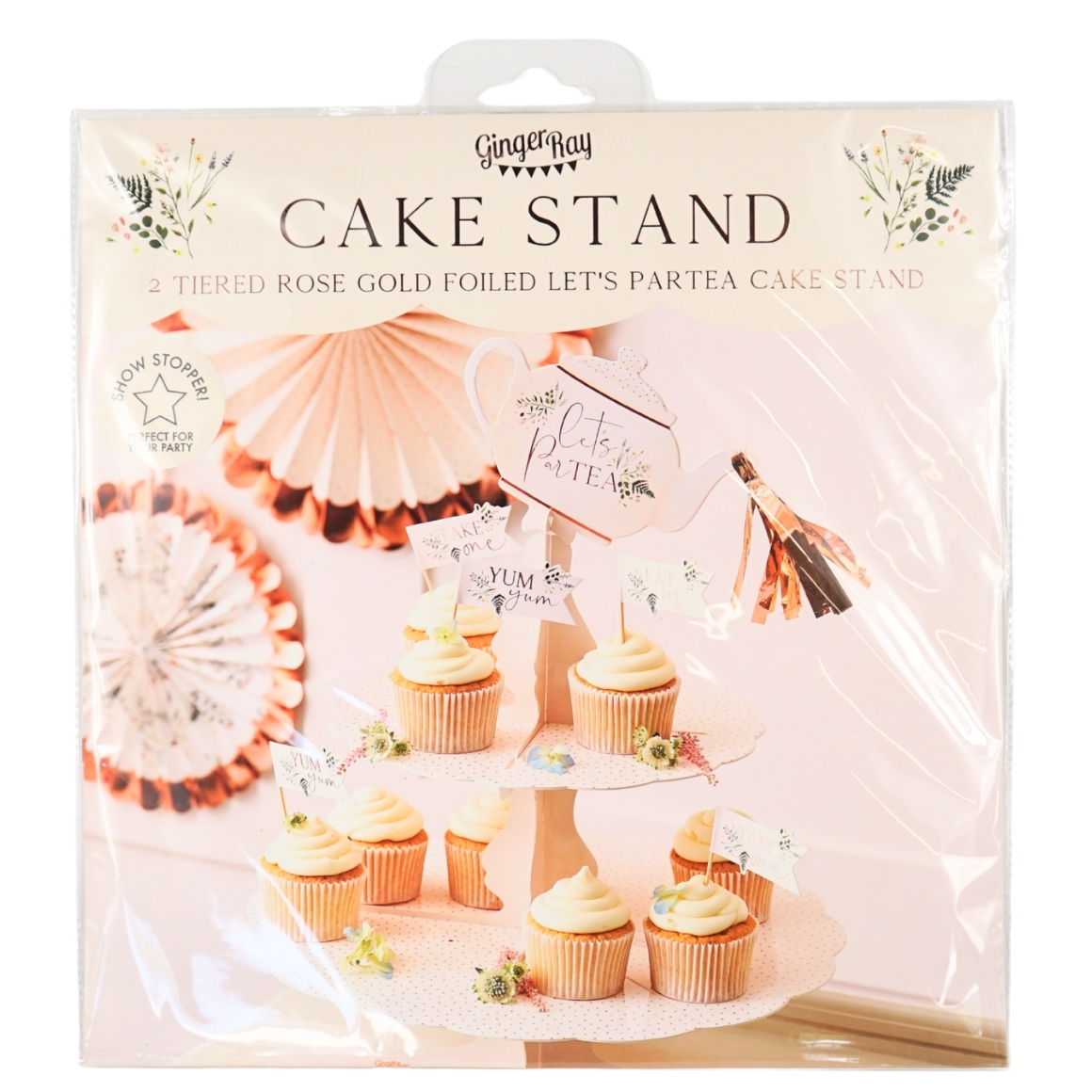 Presenteer cupcakes en hapjes stijlvol met deze kartonnen cake standaard van 36 cm. De standaard heeft twee lagen en is voorzien van een decoratieve theepot aan de bovenzijde. Afmeting circa 34,5 x 36 cm. Lichtroze met rosé gouden stippen en eenvoudig zelf in elkaar te zetten.