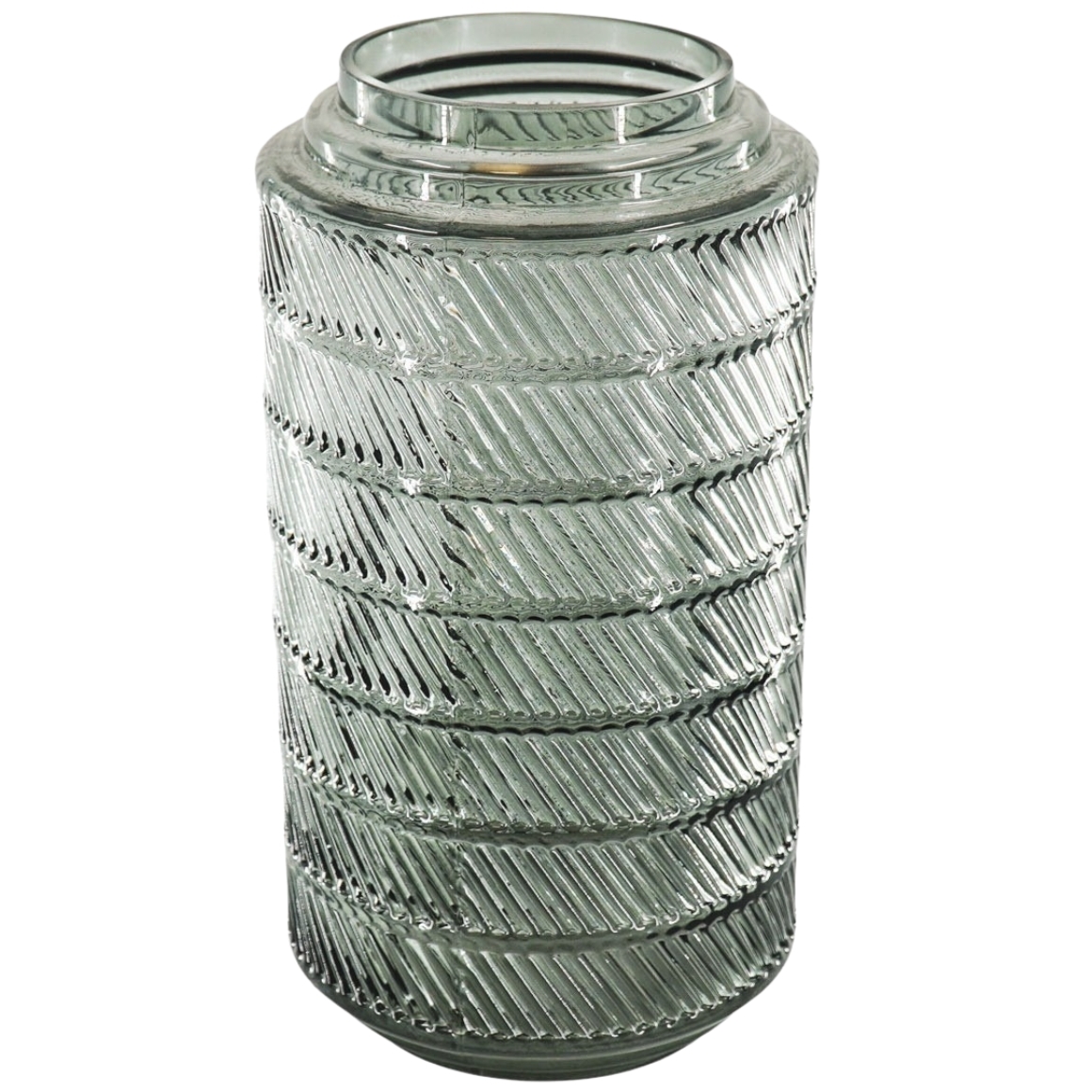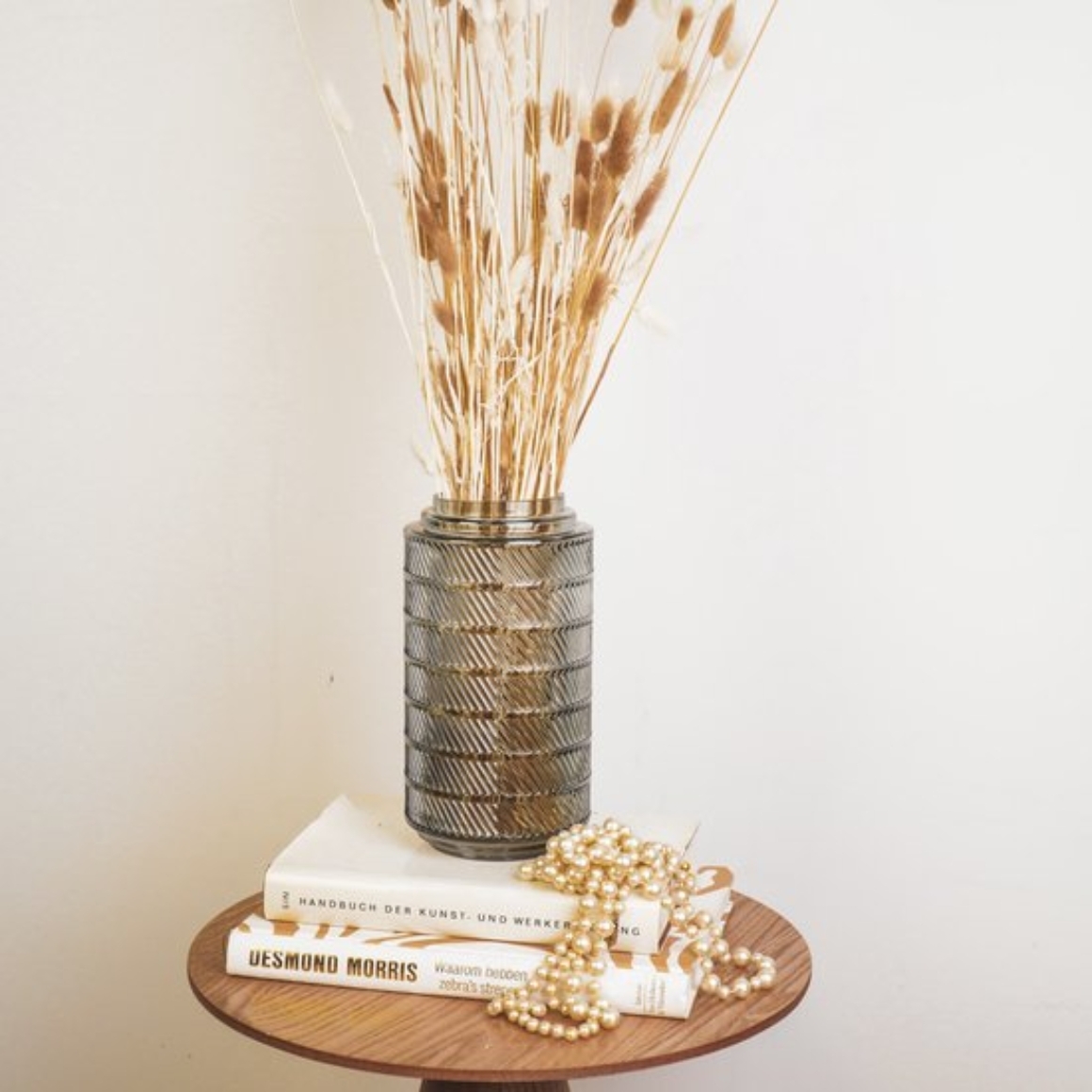 Glazen vaas van Housevitamin in grijs rookglas. De vaas heeft een stijlvol reliëfpatroon en past goed in elk interieur. Mooi te combineren met verse bloemen, droogbloemen of als los decoratief item.