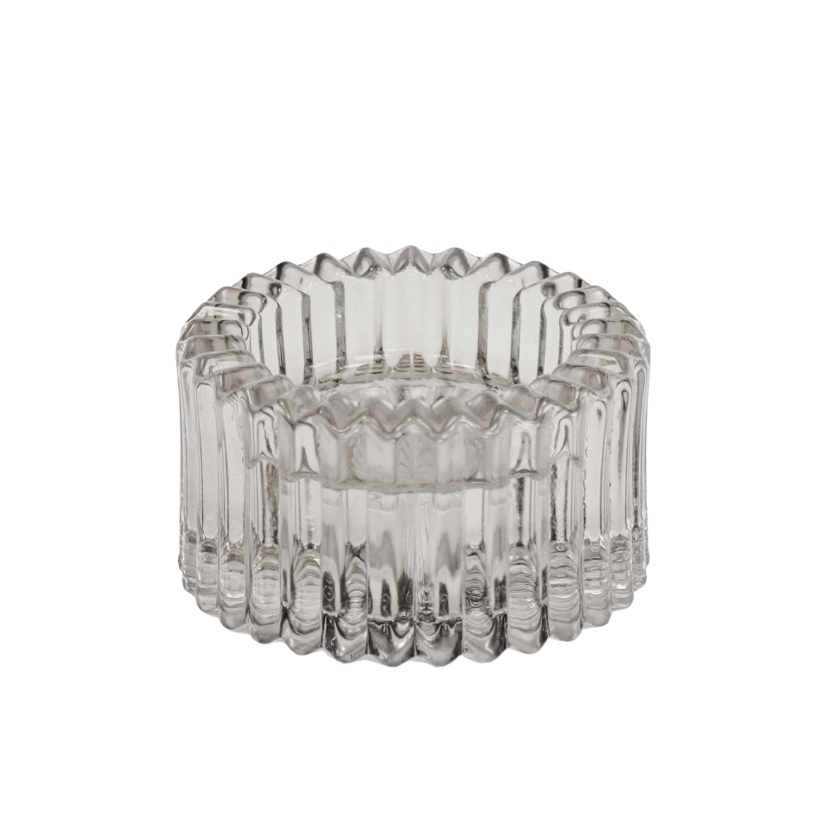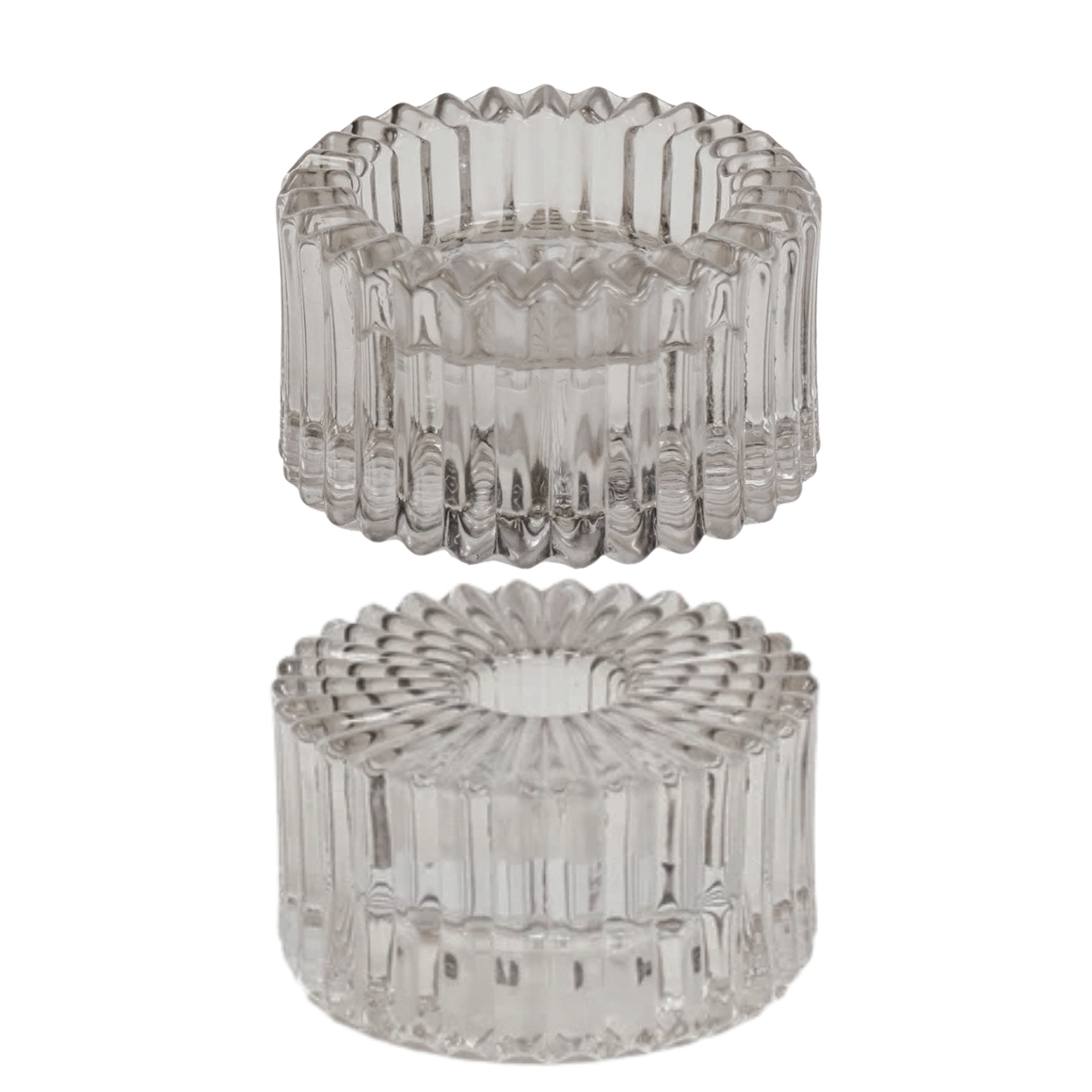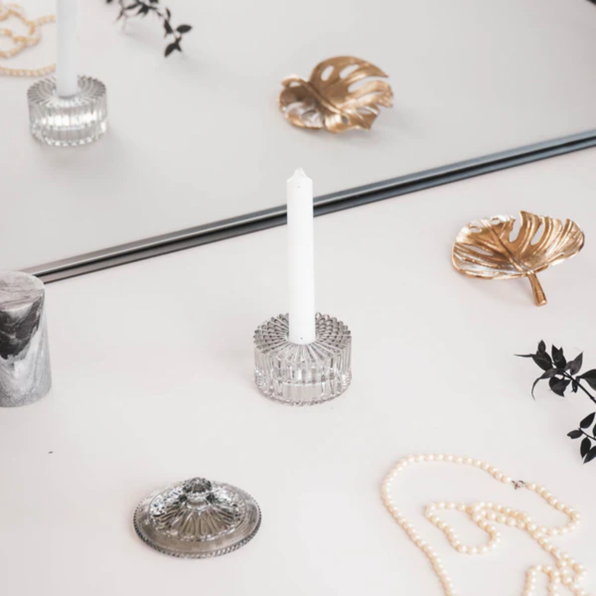 Glazen kaarsenhouder van Housevitamin in grijs rookglas met ribbelstructuur. Door het ontwerp om te draaien geschikt voor zowel dinerkaarsen als theelichten. Gemaakt van zware kwaliteit glas met een subtiele, tijdloze en sfeervolle uitstraling. Diameter 8 cm.