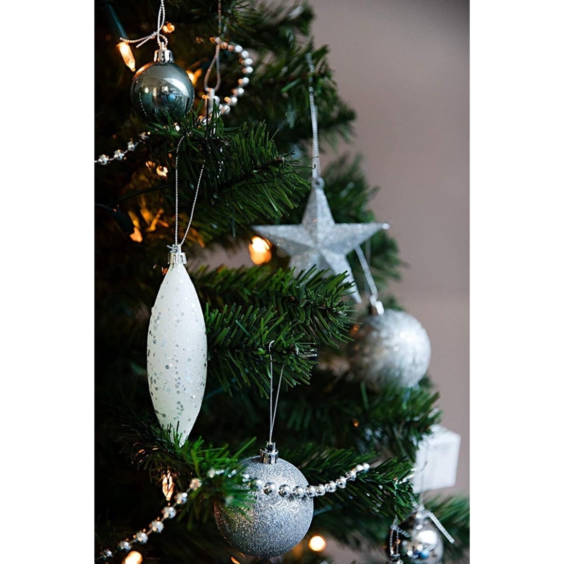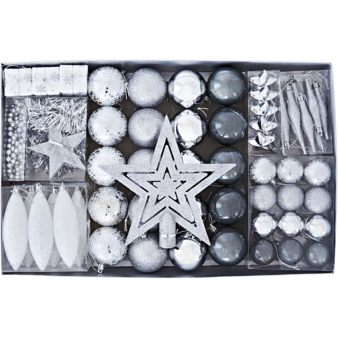 Deze set bevat zestig zilverkleurige kerstdecoraties, waaronder glanzende, matte en glitterballen, aangevuld met ijskristallen, sterornamenten en een piek in stervorm. De lichtgewicht ornamenten van kunststof zijn breukbestendig en voorzien van ophanglusjes. Dankzij de transparante opbergdoos kunnen de decoraties na gebruik eenvoudig worden opgeborgen.