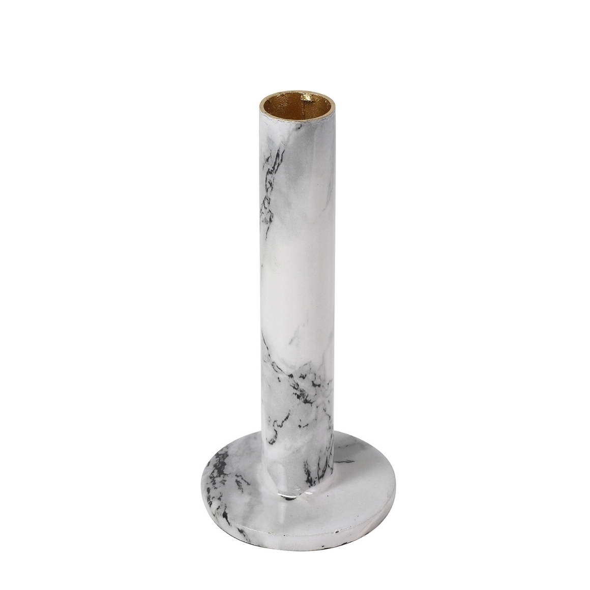 Metalen kaarsenhouder met witte marmerlook, geschikt voor dinerkaarsen met een diameter van 22 mm. De houder is 16 cm hoog en vormt een elegante toevoeging aan elk interieur. Combineer met andere maten voor een stijlvol geheel.