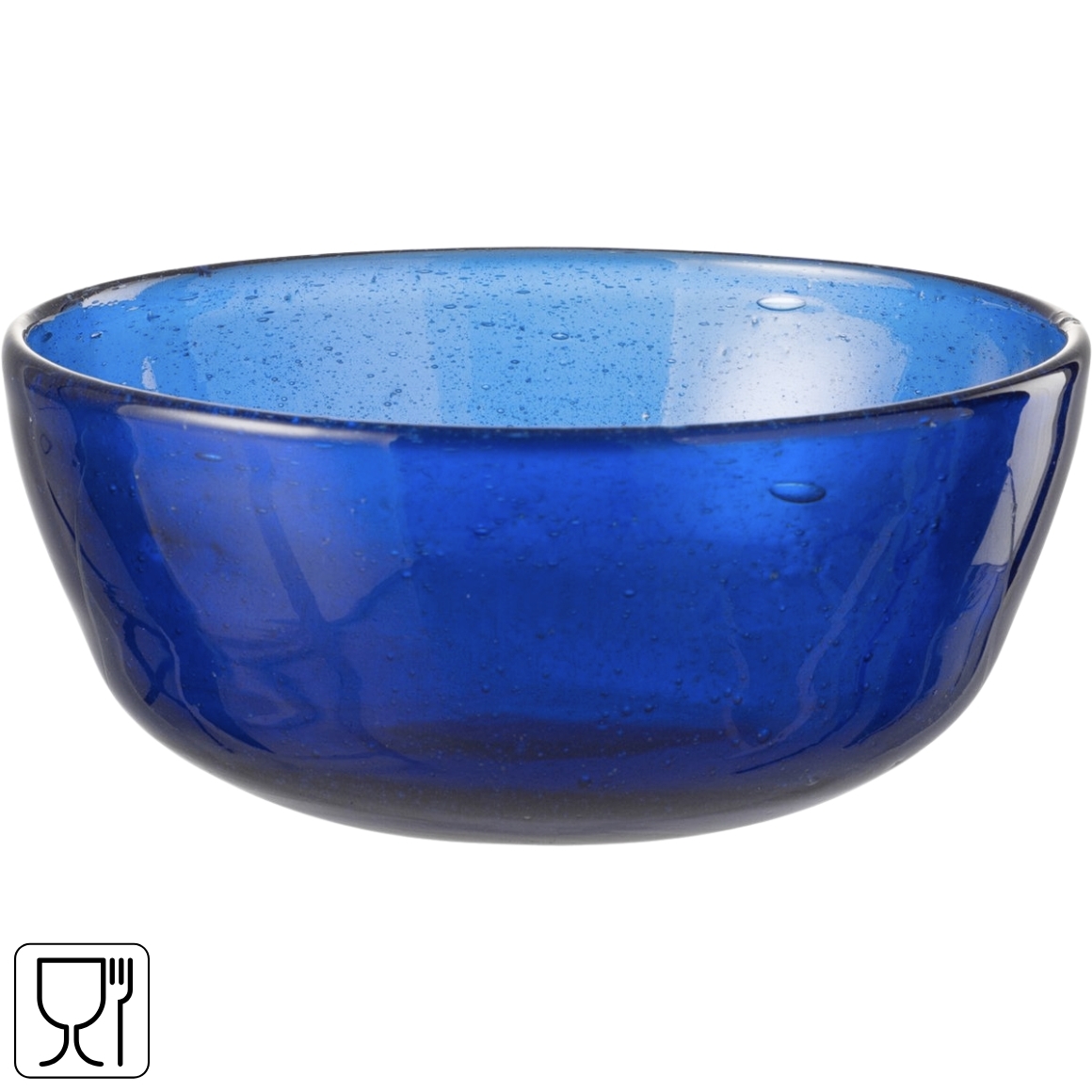 Blauwe glazen schaal uit de Lisboa-serie van J-Line. De schaal heeft een subtiel doorzichtig ontwerp met luchtbel-effect en is foodsafe. Perfect voor het serveren van hapjes of als stijlvolle decoratie op tafel.