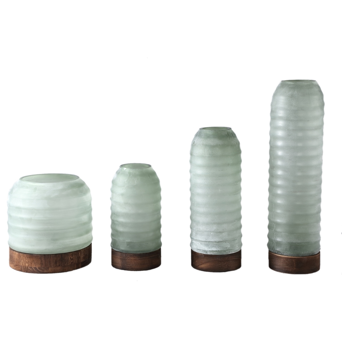 Een decoratieve vaas van PTMD, gemaakt van glas met een matte afwerking en houten basis. Deze vaas combineert natuurlijke materialen voor een warme en moderne uitstraling in elk interieur.