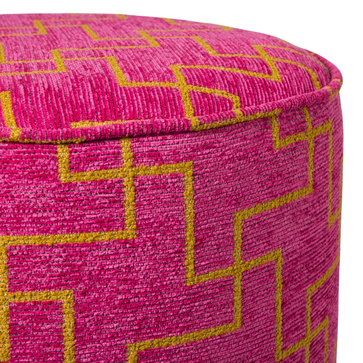 Moderne poef in roze met geel geometrisch patroon. Met een diameter van 35 cm en een hoogte van 39 cm is deze poef ideaal als extra zitplaats of decoratief accent in huis.