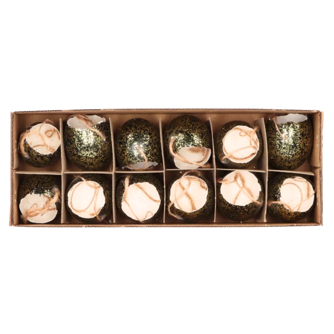 Set van 12 decoratieve eieren in zwart met ophangtouw. De eieren zijn gemaakt van echte eierschalen en hebben een formaat van 5 cm. Ideaal voor paasdecoraties, bloemstukken of seizoensarrangementen. Eenvoudig op te hangen dankzij het touwtje.