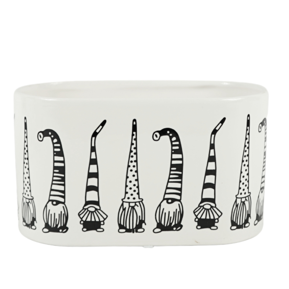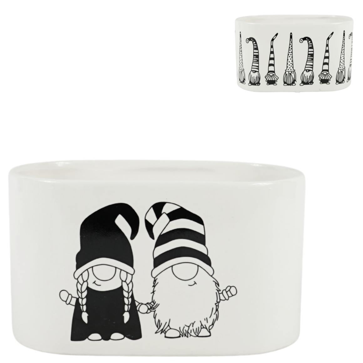 Artikel wordt assorti geleverd, de prijs is per stuk. Deze ovale bloempot met een grappig kabouterdesign is een speelse toevoeging aan elk interieur. De pot is gemaakt van keramiek en uitgevoerd in zwart-wit. Geschikt voor planten of als decoratief item op tafel of vensterbank.