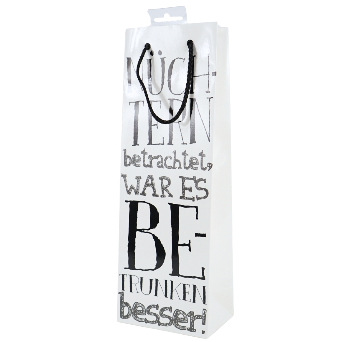 Geschenktas met Duitse tekst, 36 cm hoog. Gemaakt van stevig papier met glanzende afwerking en voorzien van zwarte koordhandvatten. Geschikt voor een wijnfles of ander smal cadeau.