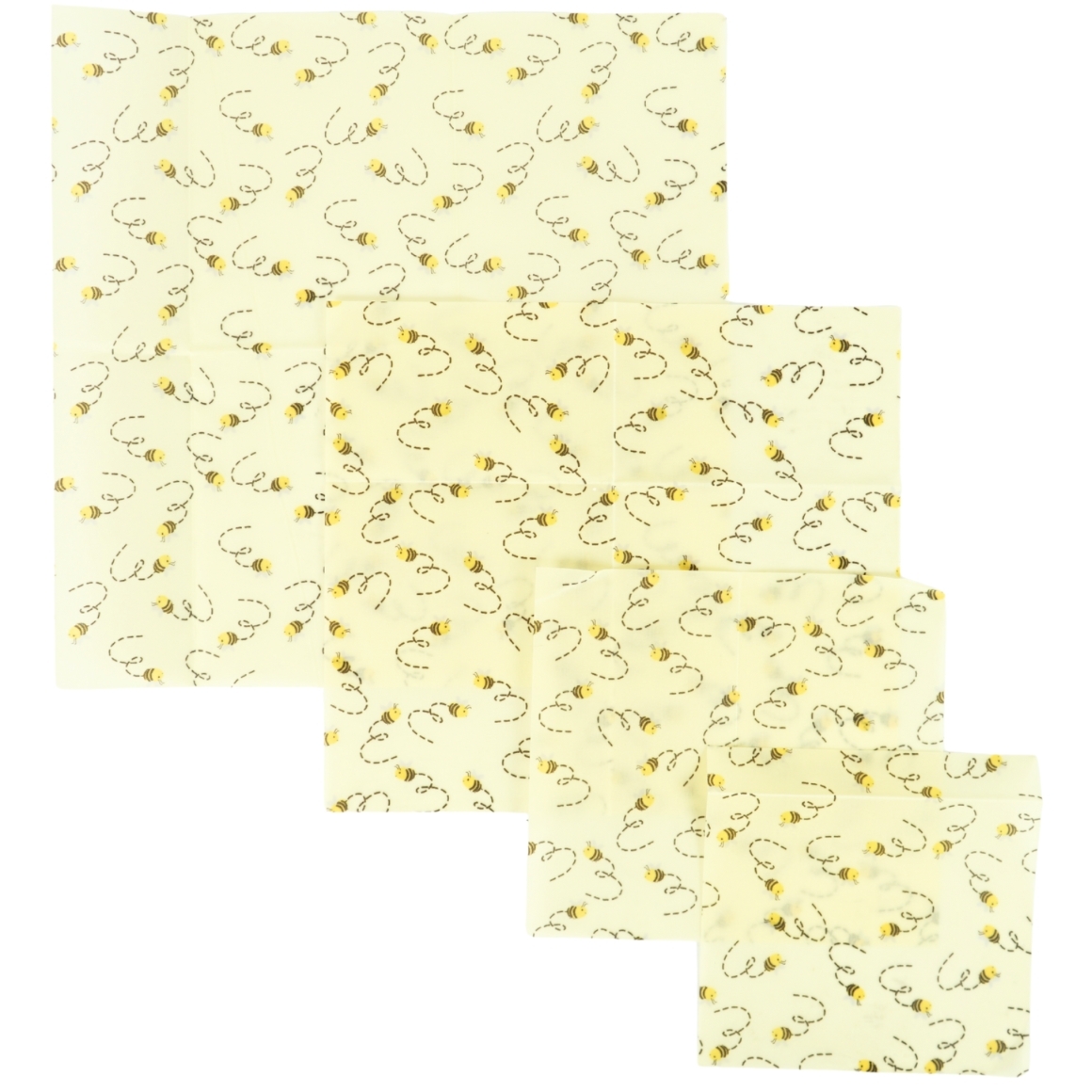Set van 4 herbruikbare bijenwas folies van Greenminds, gemaakt van biologisch katoen met bijenwas, hars en jojobaolie. Perfect om voedsel vers te houden. Een natuurlijk alternatief voor plastic folie. Afmetingen tot 33 cm.