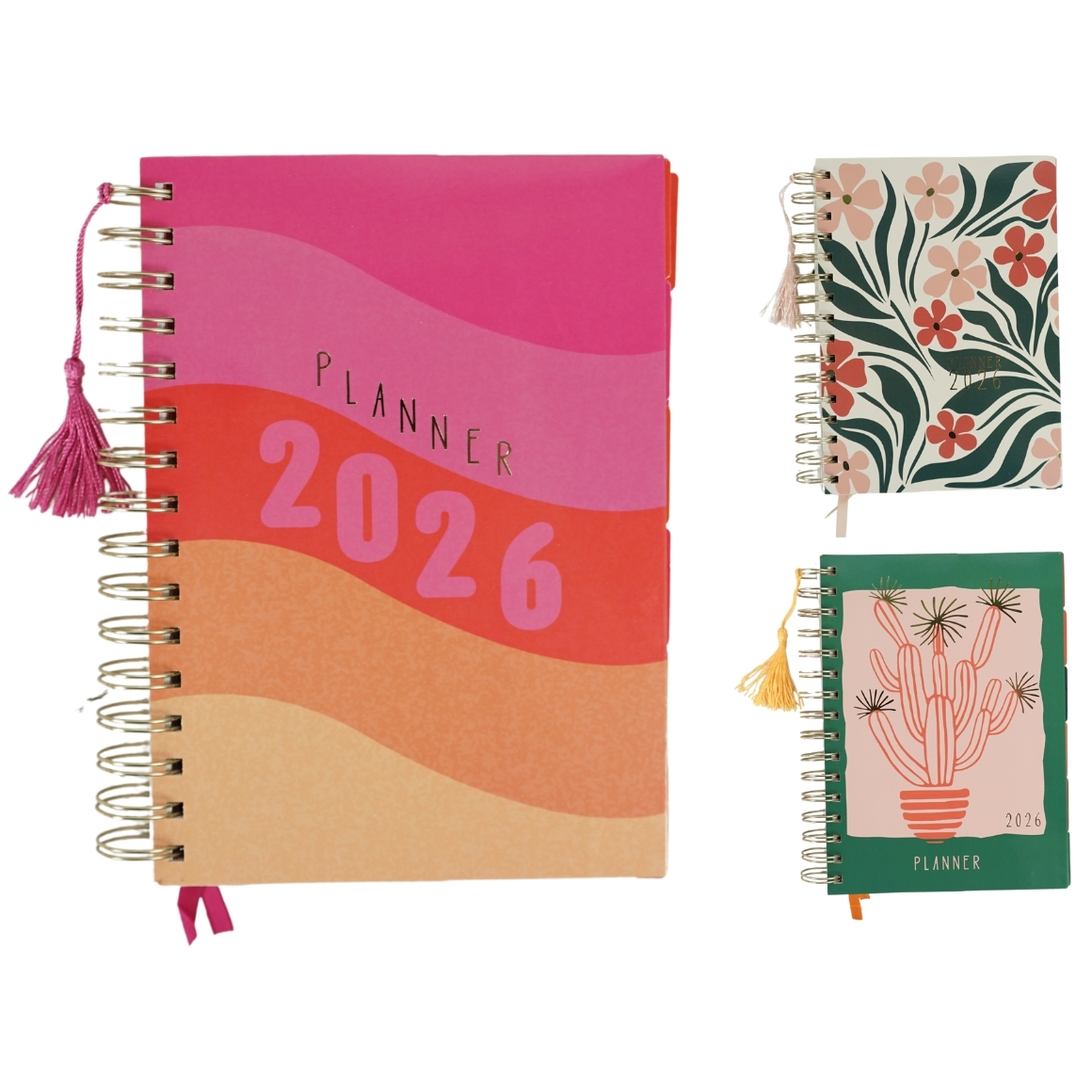 Artikel wordt assorti geleverd, de prijs is per stuk. Stijlvolle planner voor 2026 in A5-formaat met stevige ringband, maandtabbladen en leeslint. De drie verschillende designs met vrolijke prints zorgen voor een frisse uitstraling. Perfect voor het plannen van afspraken, doelen en notities.