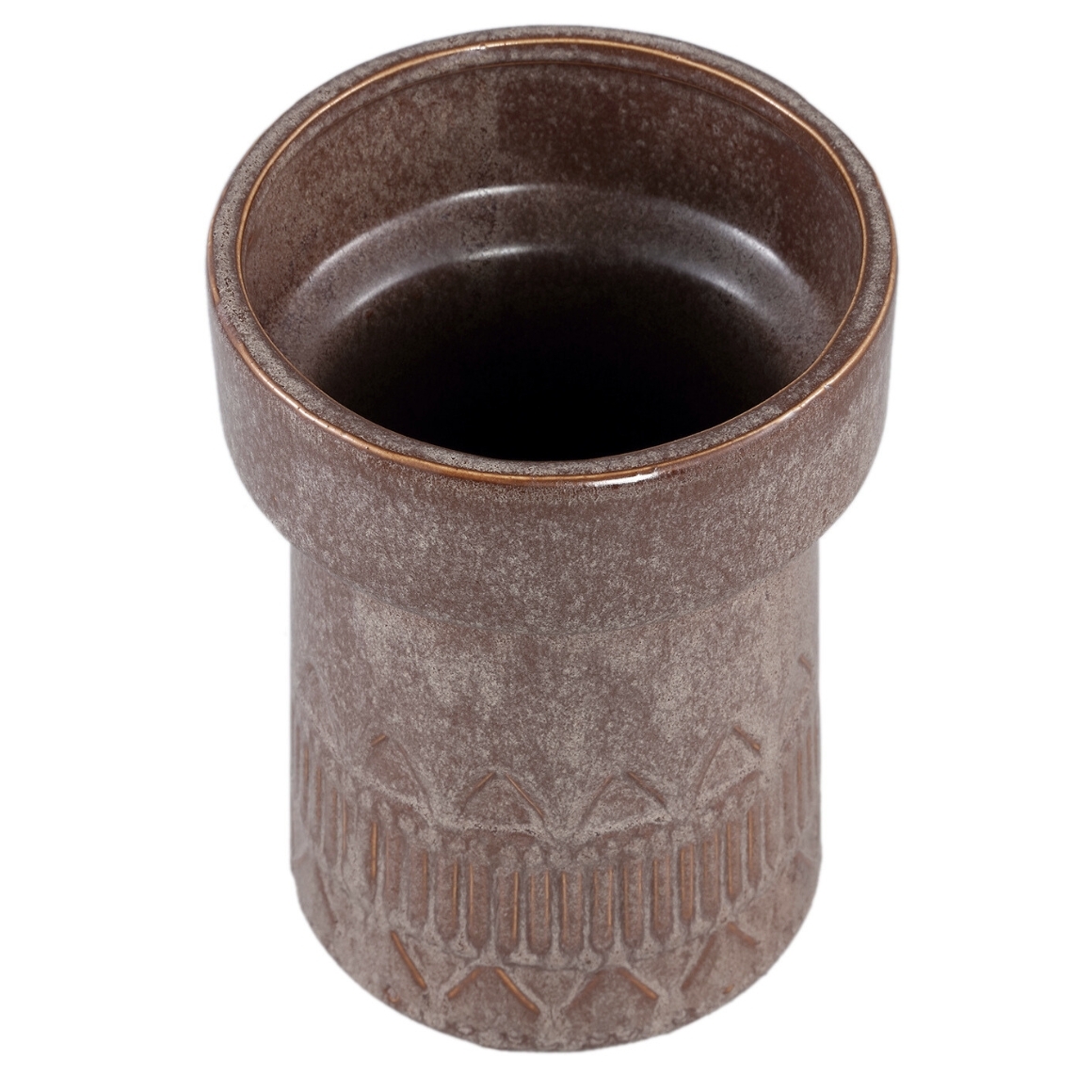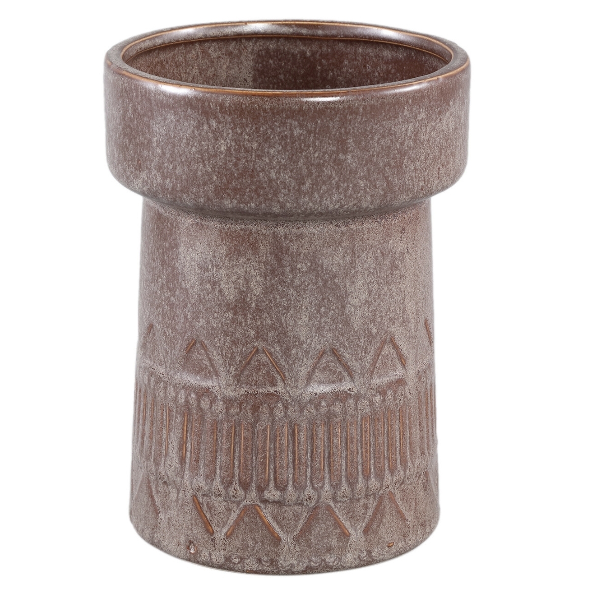 De bloempot is gemaakt van keramiek en rondom gedecoreerd met strepen en driehoeken.
