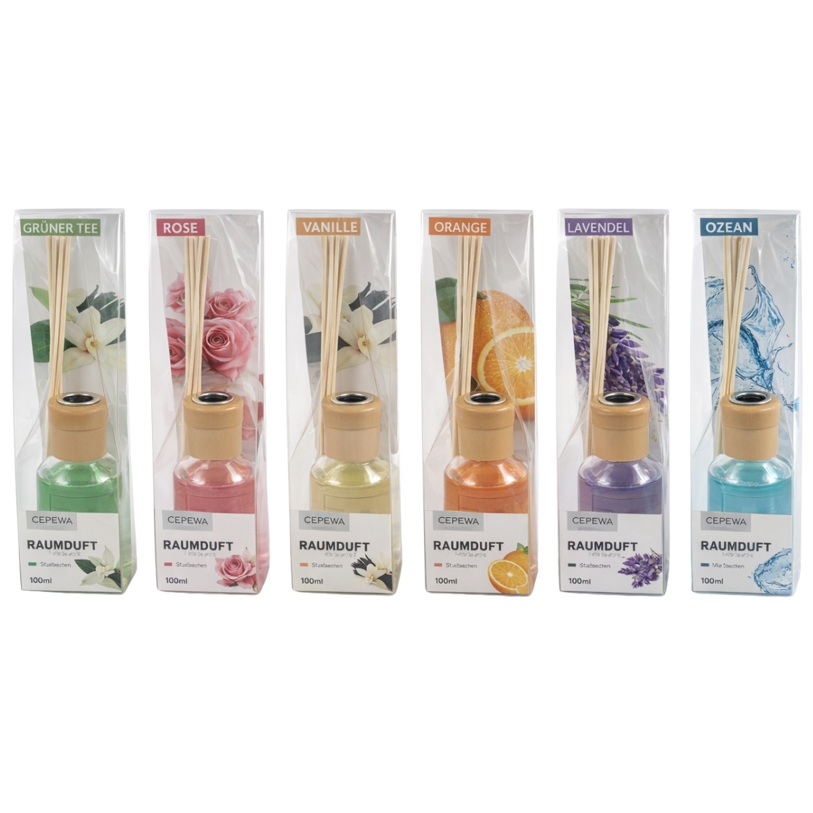Artikel wordt assorti geleverd, de prijs is per stuk. Set geurstokjes in glazen flesjes van 100 ml. Verkrijgbaar in 6 verschillende geuren. Zorgt voor een aangename, langdurige geur in elk interieur.