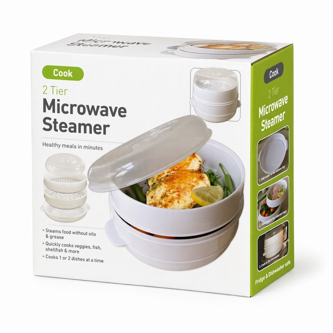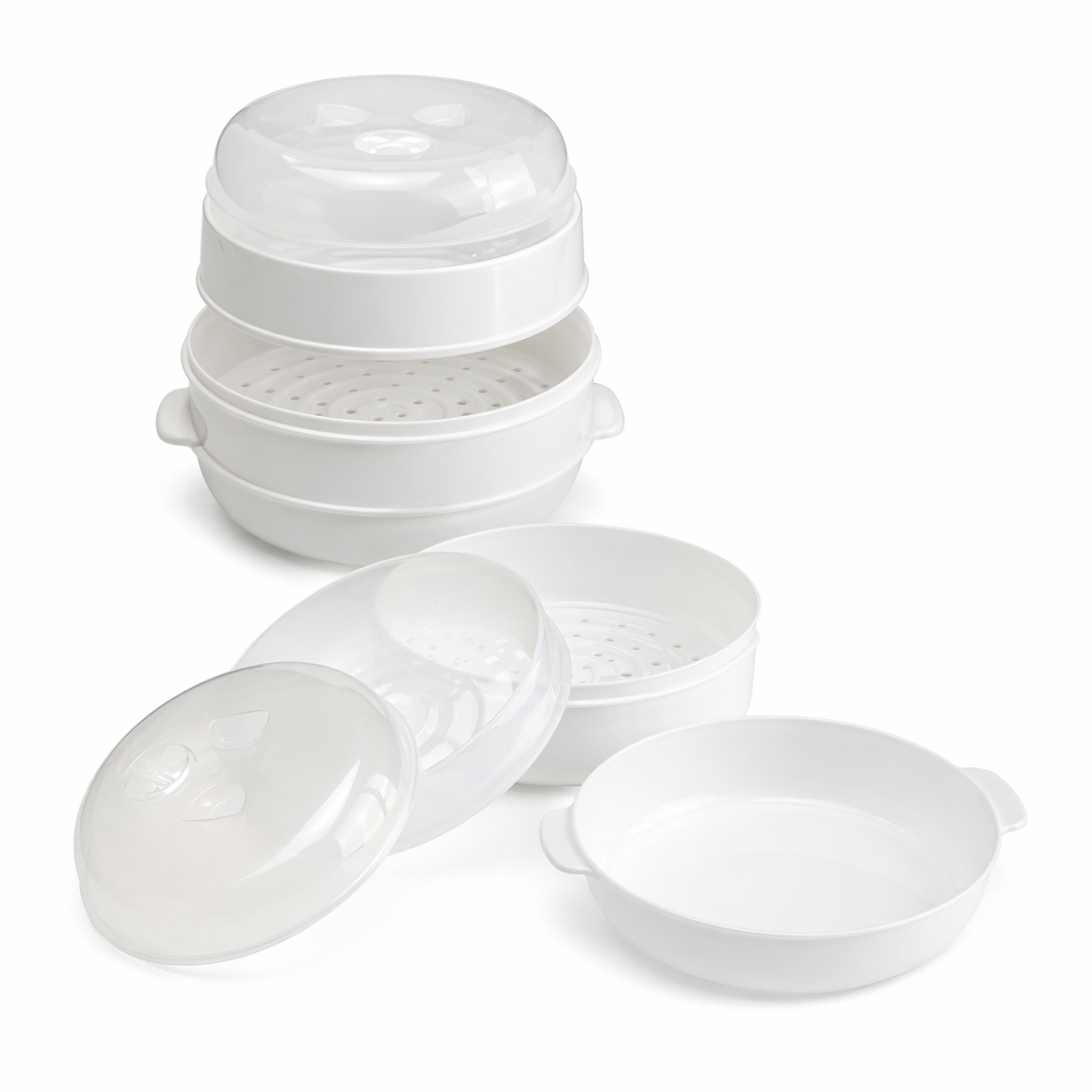 Magnetron stomer in witte uitvoering, bestaande uit vier delen: waterbak, onderste en bovenste stoommand met gaatjes en een deksel. Geschikt voor het gelijktijdig bereiden van twee gerechten. Maakt het mogelijk om voedsel te stomen zonder olie of boter. Gemaakt van foodsafe materiaal en geschikt voor gebruik in de vaatwasser.
